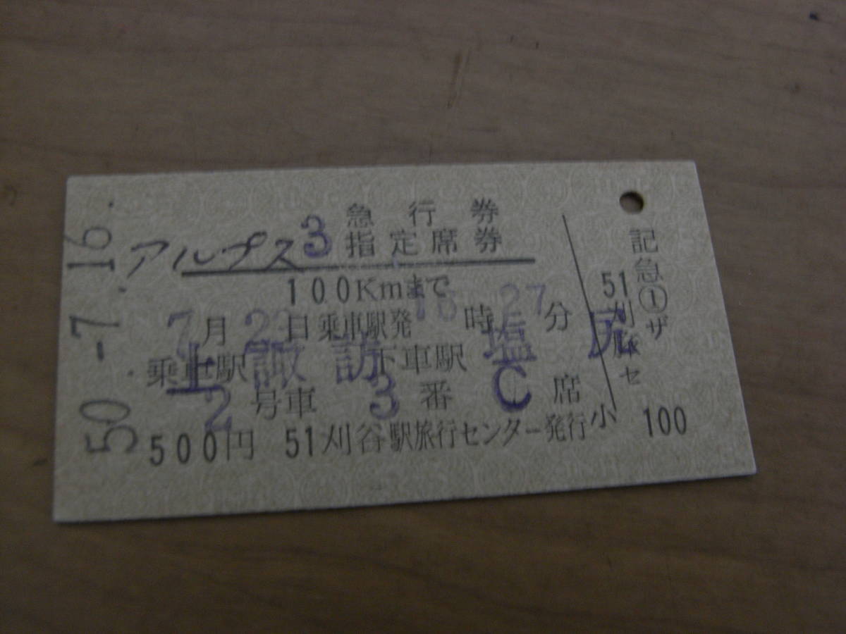 ②アルプス3号 急行券 指定席券 乗車駅 上諏訪 下車駅 塩尻 昭和50年7月16日 刈谷駅旅行センター発行