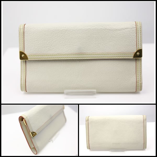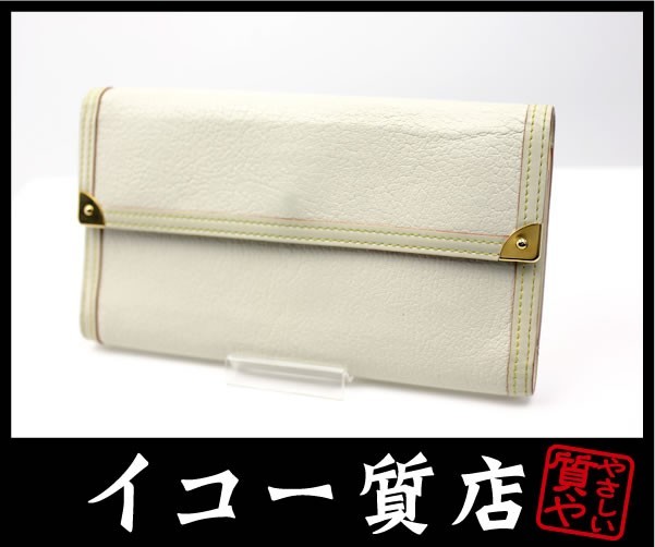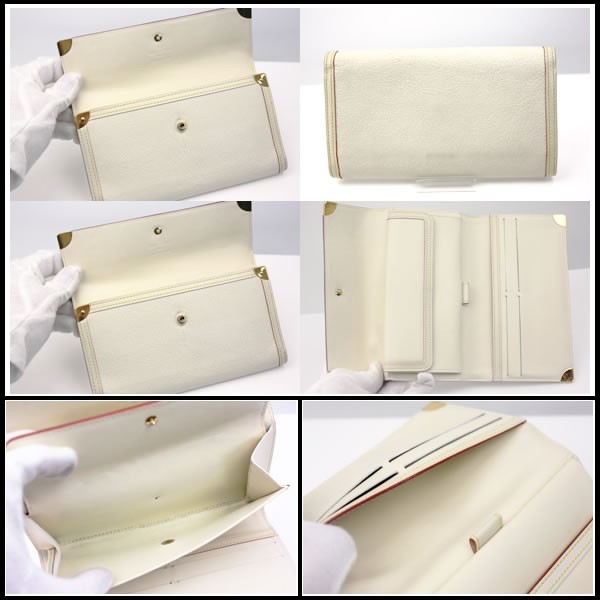 | その他商品説明 | エレガントな雰囲気が魅力のルイヴィトン・スハリラインより、「ポルトトレゾール・インターナショナル」をご紹介します。マークジェイコブスがデザインを手掛け、丈夫で独特な手触りが魅力のゴートレザーを使用した三つ折り長財布です。白色のレザーにあしらった黄色のステッチとゴールド金具が、デザインのアクセントになっており大変お洒落です。財布内部は複数のポケットが備わっており、特に小銭入れが大ぶりで使い易く大変実用的です。また、素材に使用しているゴートレザーは丈夫な皮革の1つで、末永くご愛用いただけます。この機会に是非ご検討下さい。 状態:表面のゴートレザー部分には、全体に薄汚れが見られます。ゴールド金具には小傷があり、縁の折れ目部分にはシワが見られます。財布内部は折れ曲がる部分に使用に伴うヒビ割れが多数見られ、小銭入れ内側に薄汚れがあります。また、オープンポケット・札入れの端部分に経年による接着剤の変色痕が見られます。ランクBですが、お手に取っていただければ必ずご満足頂ける商品です。 |