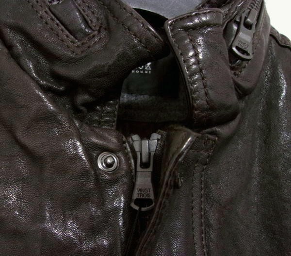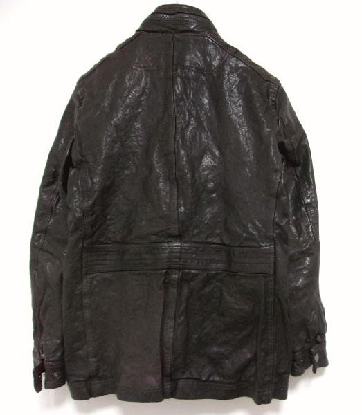 ◆23区HOMMEの上質なレザーにウォッシャブル加工が施され、絶妙な皺感と色の濃淡が表現されたミニマムでタイトなシルエットのイタリアンレザージャケット新品です。 M65、モーターサイクル、サファリ、ミリタリージャケットなどのデザインが取り入れられております。 襟ジップ内にフードあり。前合わせは内側ダブルジップとボタンの比翼です。 定価は¥160.000+税です。 表記サイズ 46 (※ブランドサイズ展開で46はMサイズに値しますがミニマムタイトデザインにつきSサイズ相当) 実寸サイズ 肩幅:40cm 身幅:47.5cm 着丈:67.5cm 袖丈:57cm ※すべて平置きにして採寸しております。 採寸は参考程度とさせていただきます。 カラー ダークブラウン系 素材 ・本体 羊革 ・別布 ポリエステル100% ・部分使い 毛90% ナイロン10% ・裏地 綿50% キュプラ50%