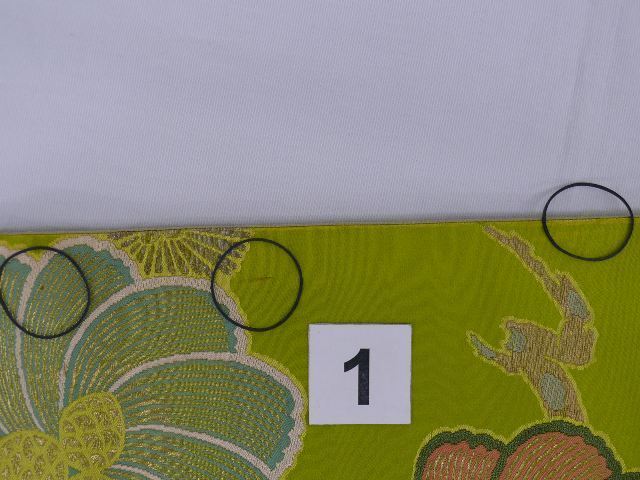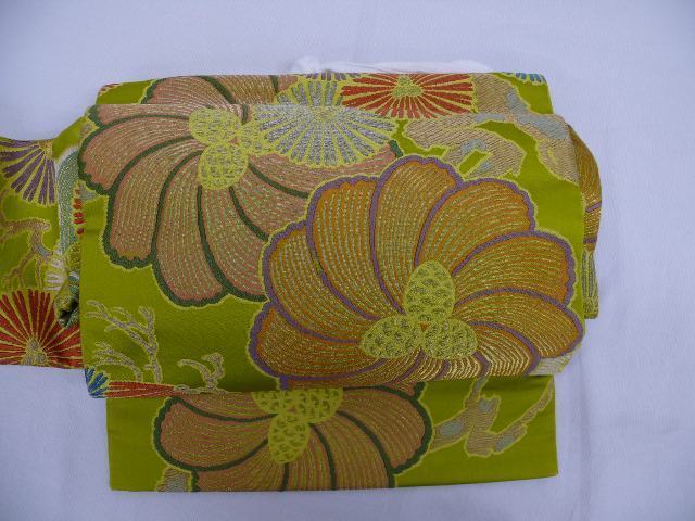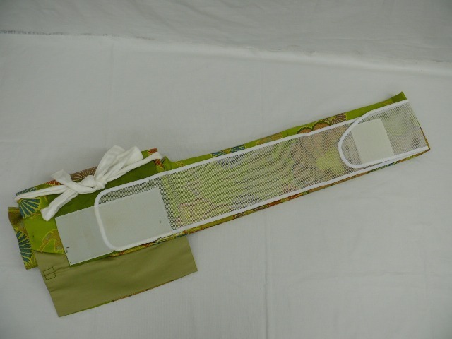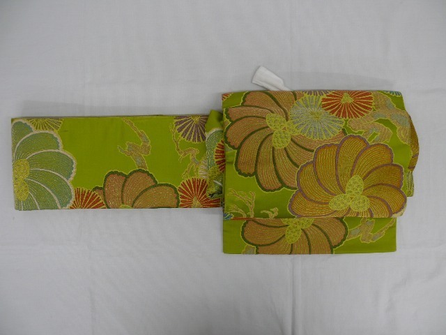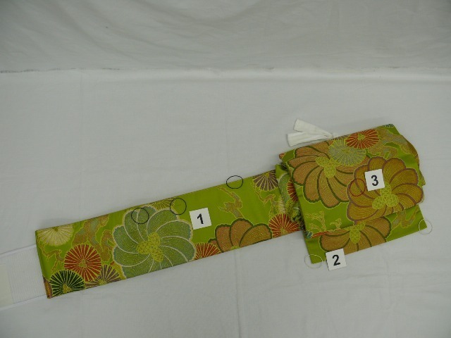 つややかな地に金銀糸がふんだんに使用された二重太鼓になるつけ帯(作り帯)です。胴回りをマジックテープで留めるタイプで、腰パッドが付属しています。太鼓部分が縦に短く、太鼓下がぷっくりと膨らんだ粋な変わり結びになっています!全体に金糸が織り込まれた明るめな鶯色の地に、金銀糸をふんだんに使用して大輪の菊花や松が織り出されています。実際のお色は下から4枚目の写真に近いお色になっております。半幅部分にシミが1つと擦れ、たれの両かどに擦れ、お太鼓部分に糸の抜けがあります。写真をご確認の上、ご購入下さいませ。腰紐に少し薄い汚れがありますが、写真はありません。ご着用可能な範囲かと思います。写真以上に上品で、素敵な帯ですので、是非この機会にお求めくださいませ。[素材]正絹 (素材にはクラフト糸、金属糸などが含まれる場合がございます)[サイズ]太鼓の幅:30.5cm 太鼓の縦の長さ:24cmたれ先の長さ:8cm胴回りの幅:15.5cm 胴回りの最大の長さ:85cm