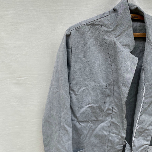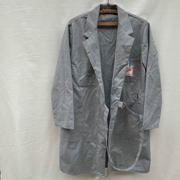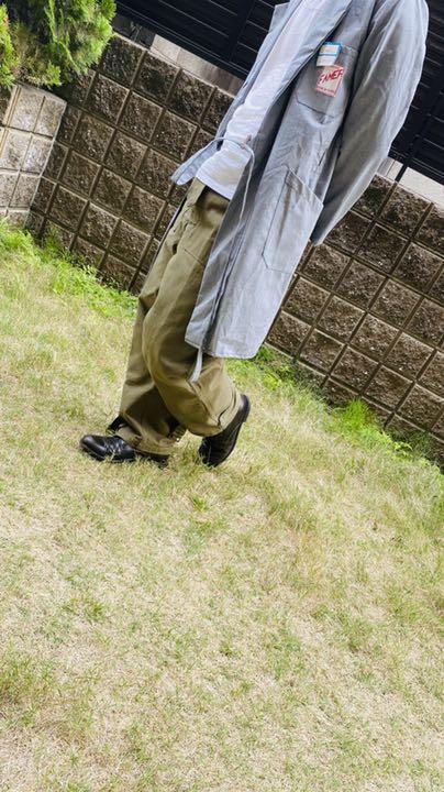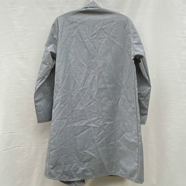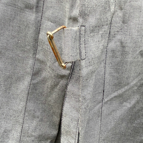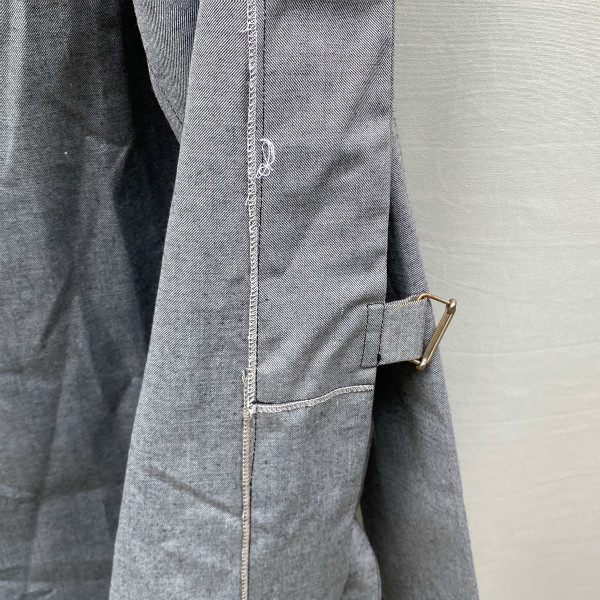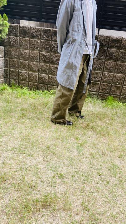 タイロッケンのためベルトで縛って前を合わせるため、ボタン等がありません。 前を開いて着るのもいいですが、長いベルトの処理に困るかと思いますし、こちらは前を閉じて着てこそのかっこよさかと思います。 比較的渋目のライトグレーという色合いで季節問わず楽しめそうです。そこそこ古いものですが、デッドストックで出ることは少ないのでこれからじっくり着られたい方に是非!! 。