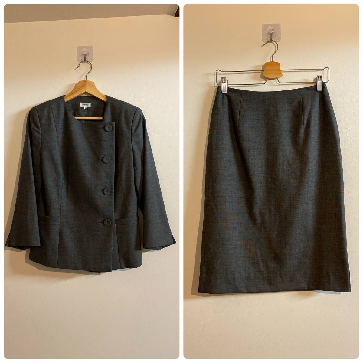 サイズはジャケット40・スカート42、平置き実寸・着丈/57cm、身幅/49cm、肩幅/39cm、袖丈/50cm、ウエスト/34cm、総丈/63.5cm、裾幅/49cm、ヒップ/50cmになります。