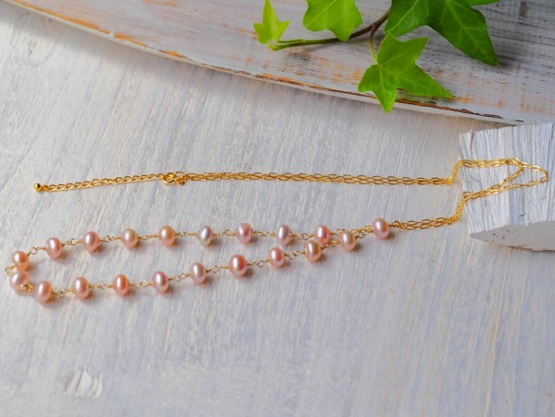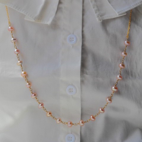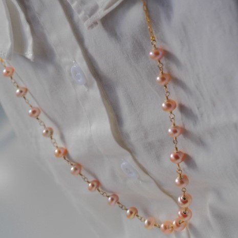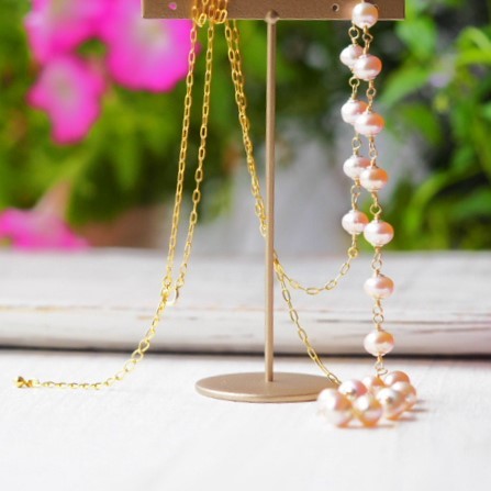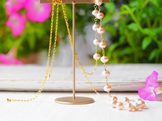 SVチェーンをプラスして長さ75cmの長さは、ワンピース、シャツに合わせて、カジュアルなトーンにも合わせやすいネックレスです。