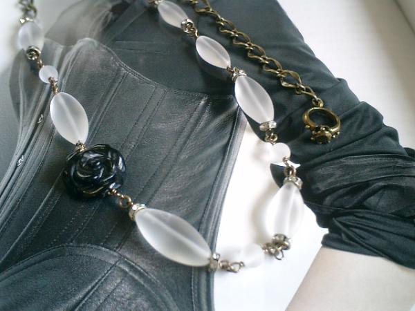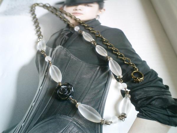 美術館をイメージして♪秘めた美しさのネックレスを作りました♪パリ(??)っぽいアンティークな雰囲気で作りました。気品のあるフロスト水晶は11×24ミリから9×18ミリ位までのマーキスと6ミリの丸玉です♪ジルコニアのロンデムや18ミリのブラックオブシディアンの薔薇を合わせてさりげなくロマンチックしています♪長さは全長65センチ位で調節自由です♪やさしいホワイトのフロスト水晶はシックで可憐な印象です♪飽きのこないいつまでも着けられるデザインを考えて作りました!お揃いのブレスレットも出品しています♪ハンドメイドをご理解頂いてノークレーム、ノーリターンでお願いします