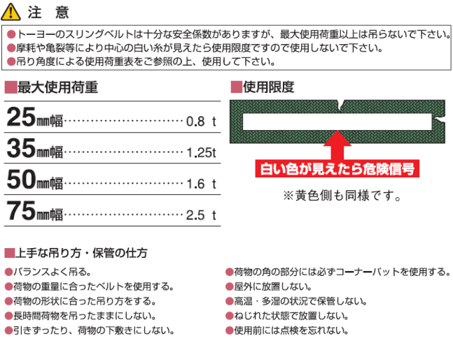 | ●材質は超強靭柔軟性ポリエステル繊維。 ●伸縮性が少なく重量物でも安定した作業ができます。 ●緑・黄の表裏2色づかいで使用時のねじれが一目でわかります。 ●柔軟性・強靭性・安定性・低価格。どれをみてもスリングベルトのキングです。 ●使用限界を知らせるために、中心に白い糸が入っています。 白い糸が見えたら危険信号。 |