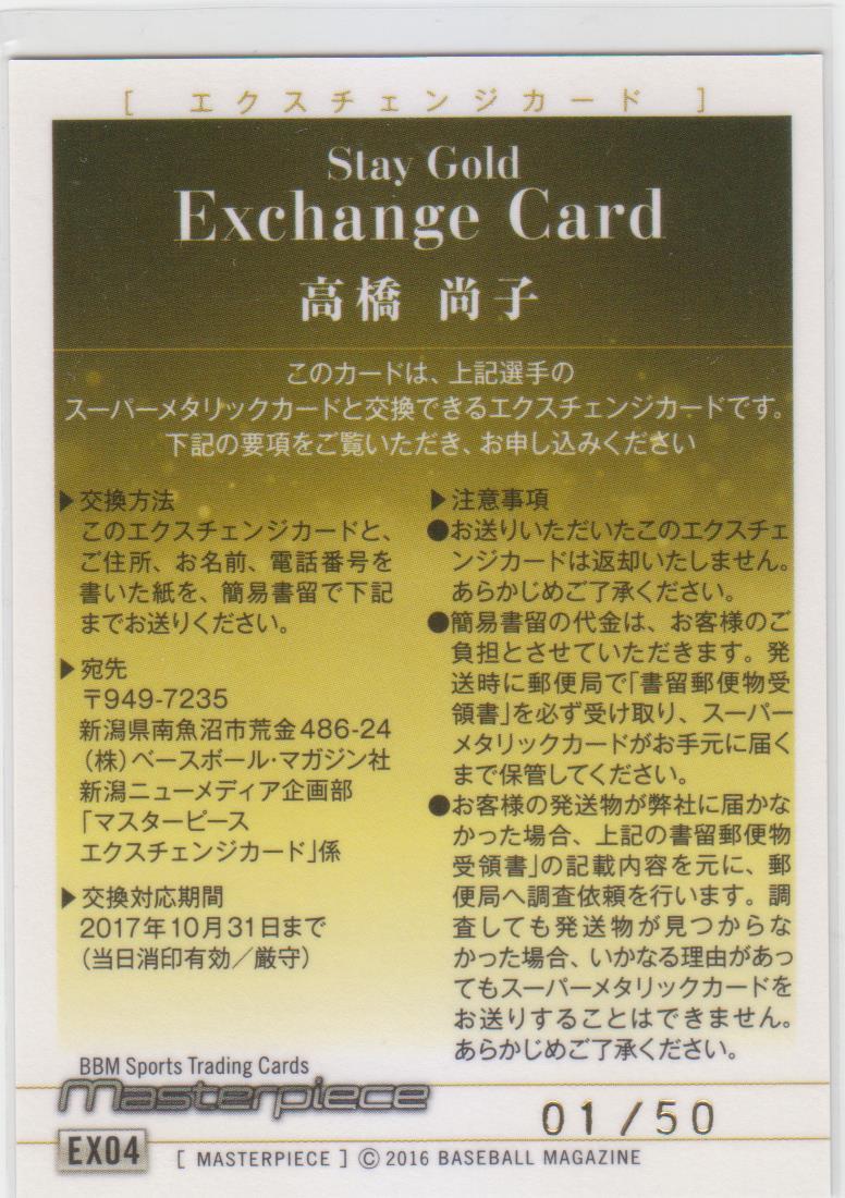パックから出るエクスチェンジカードで、50枚のシリアルナンバーが入っています。シリアルナンバーは01/50のファーストナンバーで、最良の番号です。送るとメタリックカードがもらえましたが期限が切れています。ただ、交換券自体もより希少です。カード自体も美品です。