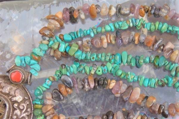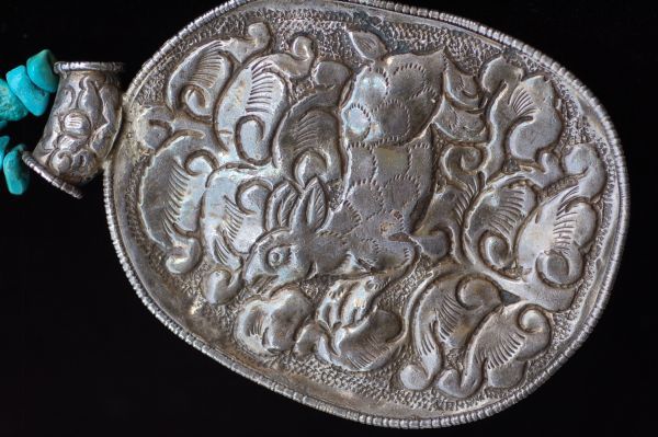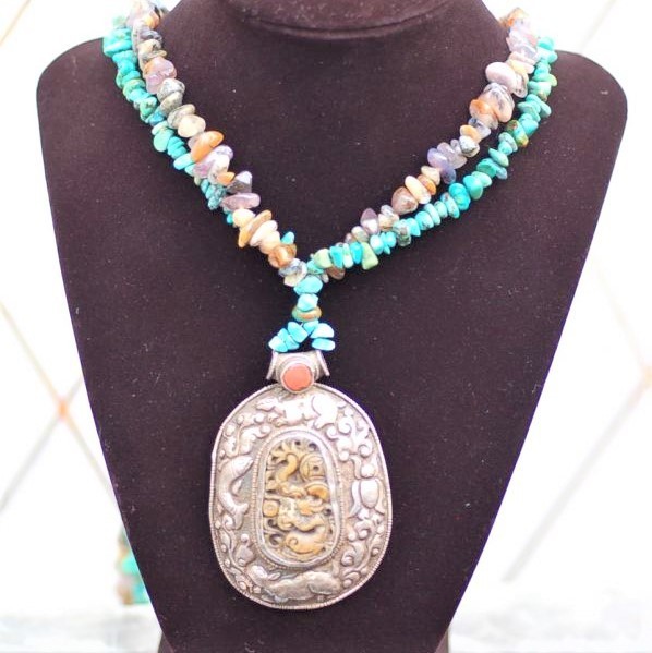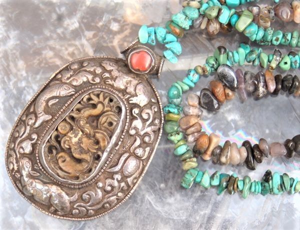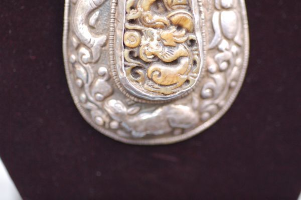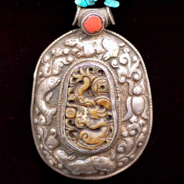 年代 :1900s前後辺り サイズ :全長90cm ペンダント 7.5cm x 5cm / 石 4cm x 2cm 素材 :銀製/ ホワイトジェイド/ターコイズ (天然石)/ ジェムストーン 重さ :約 183g 製造国 :チベット アメリカで買いつけたアンティーク、銀製ペンダントネックレスのご紹介になります。 チベットの伝統的装飾模様のデザインが施されており、オシャレなデザインになります。 銀職人によるハンドメイド作品になります。 1900年前後辺りのものではないかと推測しており、ペンダントのセンター部分はホワイトジェイドではないかと推測しております。 ジェイドにはドラゴンの彫刻が施されており、良い雰囲気です。 アンティークな雰囲気が抜群にありますので、 ポリッシュせず、このままの状態を残しております。 破損はございません。 伝統的な民族工芸のコレクションに良いかと思います。 全ての商品は古い物のため細かいキズや使用感はありますので ビンテージ品として理解頂ける方のみ入札下さい。 他にも世界のアンティーク雑貨等、多数出品しておりますので宜しければ マイオークションからご覧ください ↓↓↓ ![]() サイズは出来る限り正確に測っておりますが、多少の誤差はご了承ください。 写真をしっかりとご確認の上、入札して下さい。 (神経質な方はご遠慮下さい) 質問などありましたらお気軽に問い合わせ下さい。 尚、細かい写真など詳細をご希望の方は拡大写真を送りますので、質問欄にご希望の旨とメールアドレスをお載せ下さい。 (ご質問内容は公開される事はございません。ご安心下さい) | |||