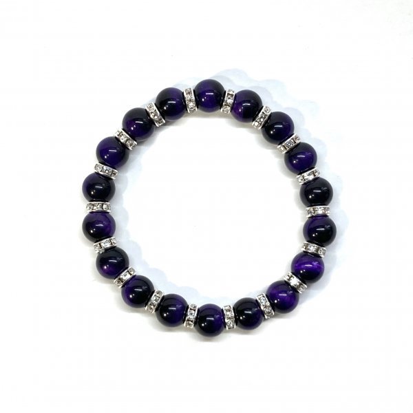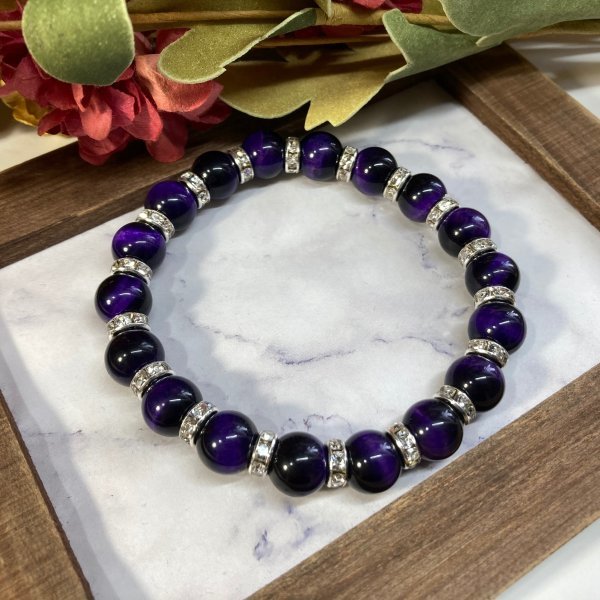 こちらは、10mm玉のパープルタイガーアイを使用したパワーストーンブレスレットです。間にはロンデルを挟み高級感あるブレスレットに仕上げています。石大きさは腕にも馴染みやすいように10mm玉を使用して、サイズは内径約18cmです。(サイズ調節も無料で承っています。サイズ変更の場合は落札後、取引ナビにてご一報くださいませ。) 数に限りがございますので気になる方はお早めにどうぞ。