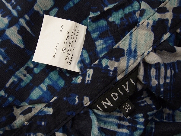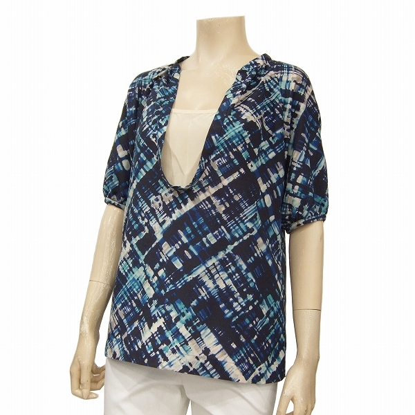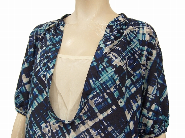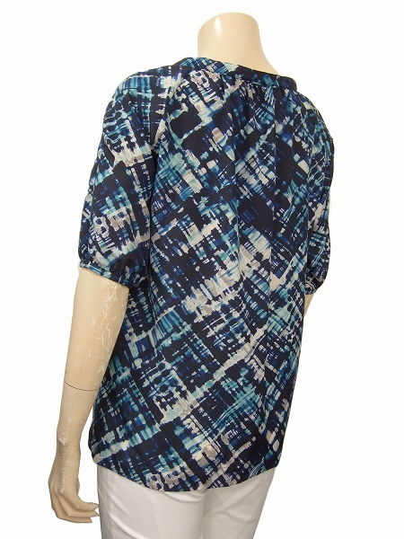 Ut極美品★インディヴィ*INDIVI★ブルー系★ペイント風★オーバルネック★五分袖★鮮やかなブラウス★38号(M・9号)