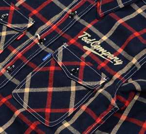 素材はコットン100%のフランネル生地。フランネルはシャツ生地に起毛をかけたもので、主に秋冬用、アウトドア用として使われる生地です。厚すぎず、薄すぎず、インナーとしても、アウターとしても、幅広く着用できる適度な肉厚のネル生地です。両胸にはボタン付きフラップポケットが設けられています。左胸ポケットにはテッドマンの青色ピスネーム、右胸ポケットには赤色ピスネームが縫い付けられています。主要部分の縫製は、2本針巻き縫いのヴィンテージワークシャツの仕様を再現した王道的のつくり。両脇裾にはマチが付き、空縫いすると出てくる空環の、2本針ダブルステッチの撚り糸。左胸のロゴは柄はチェーン刺繍と通常の刺繍。背中の柄は総チェーン刺繍。