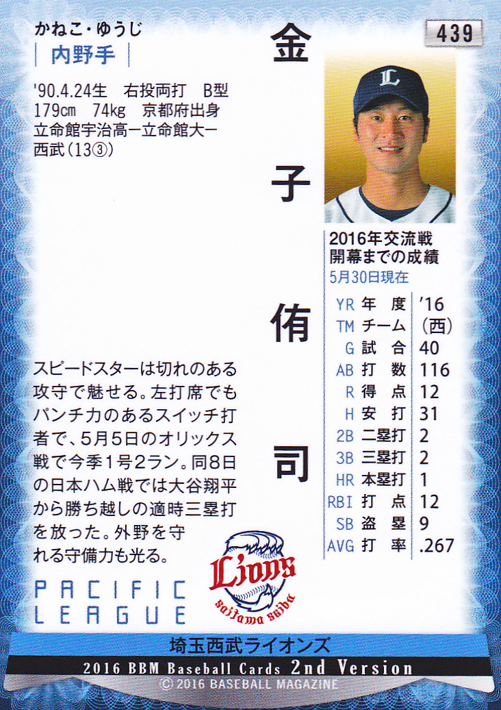 BBM2016ベースボールカード2nd 439 金子侑司 京都府 立命館宇治高校 立命館大学 埼玉西武ライオンズ