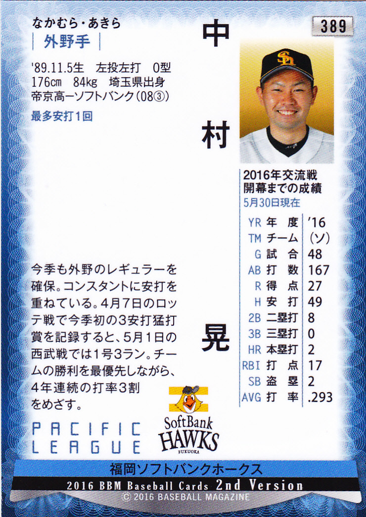 BBM2016ベースボールカード2nd 389 中村晃 埼玉県 帝京高校 福岡ソフトバンクホークス