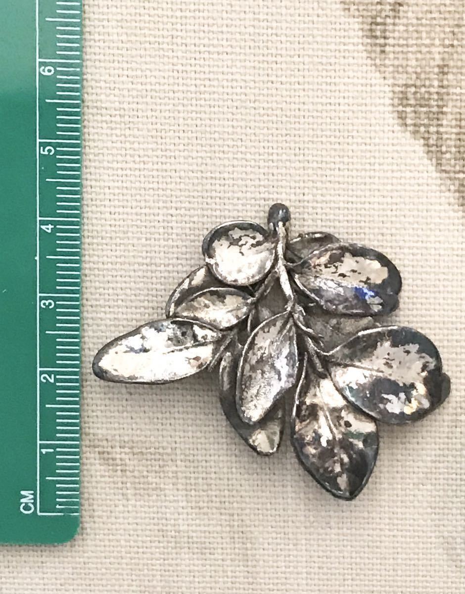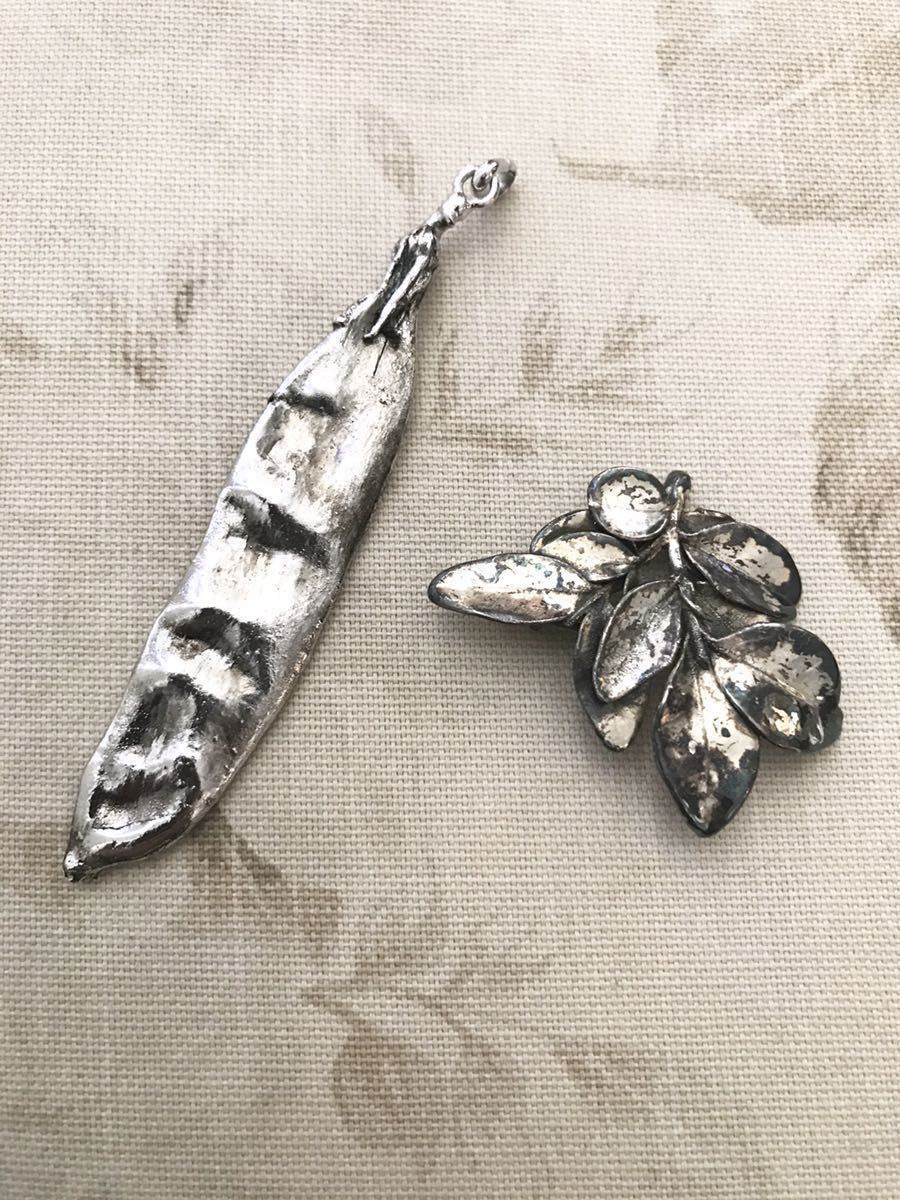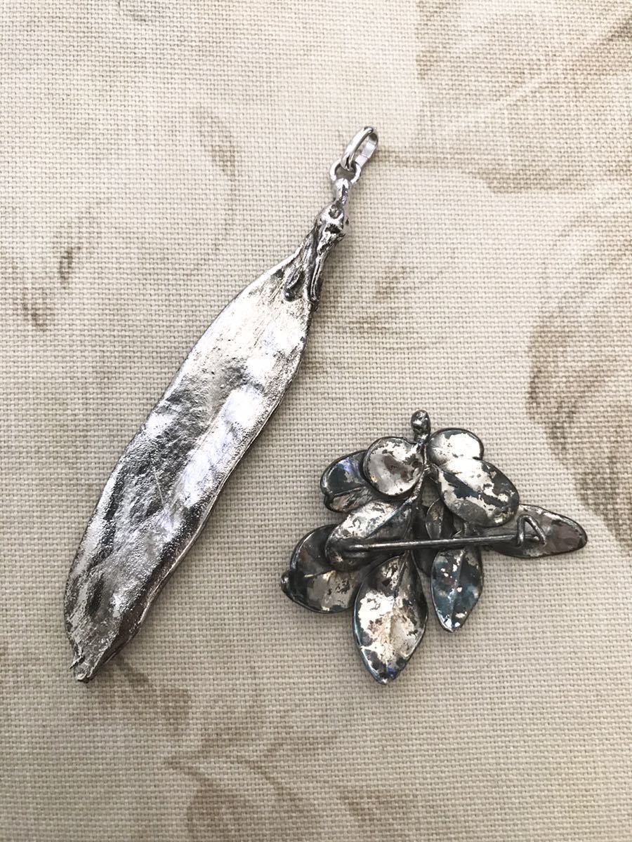 サヤエンドのペンダントトップと葉のブローチの2点。
