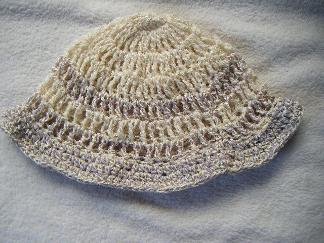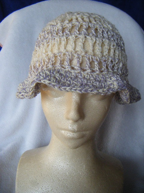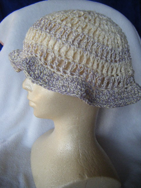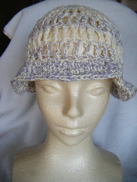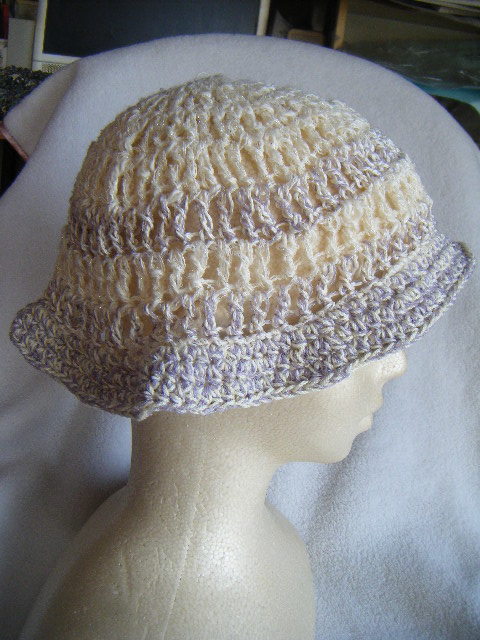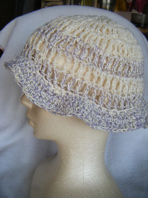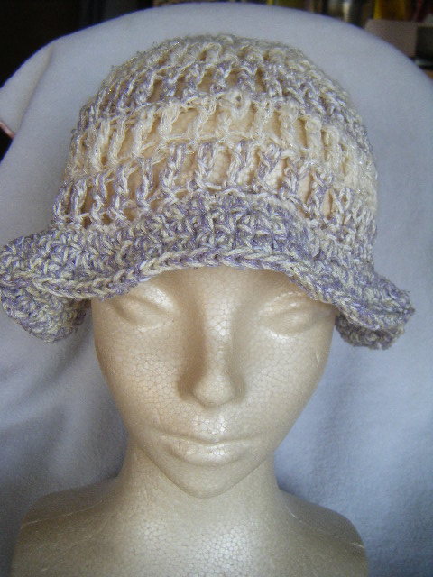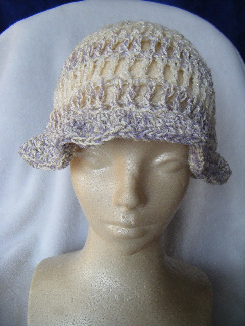 春、夏*ミニツバ付き*手編*ややゆったり幅*白に銀ラメちらり*アクセントラインとつばは薄藤*小さくまとめて携帯可 20