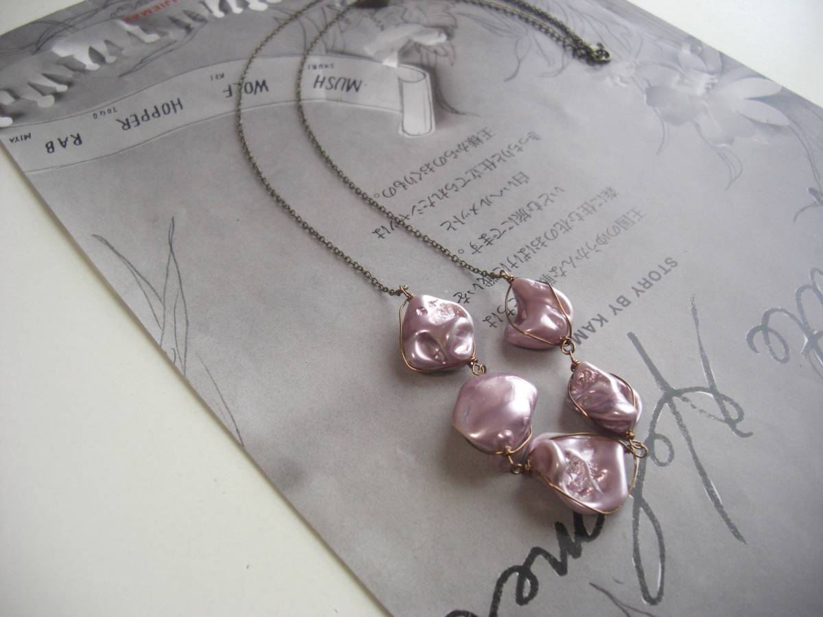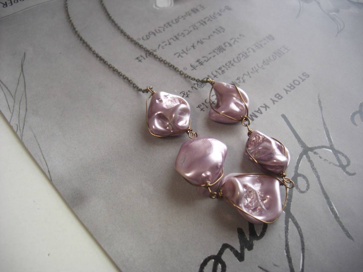 イーニドのコレクション・・シリーズです♪モンローのピンク・・個性的なモーブピンクのシェルパールのネックレスです♪15ミリから22ミリ位までのバロック型のシェルパールは存在感があるのでシンプルなデザインに仕立てました♪繊細なデザインチェーンを合わせて大人のロ マンチックしています♪長さは70センチ+アジャスター10センチで最長80センチ位です♪お揃いのブレスレットやピアスも出品しています♪シンプルで飽きのこないいつまでも着けられるデザインを考えて作りました!ハンドメイドをご理解頂 いてノー クレーム、ノーリターンでお願いします