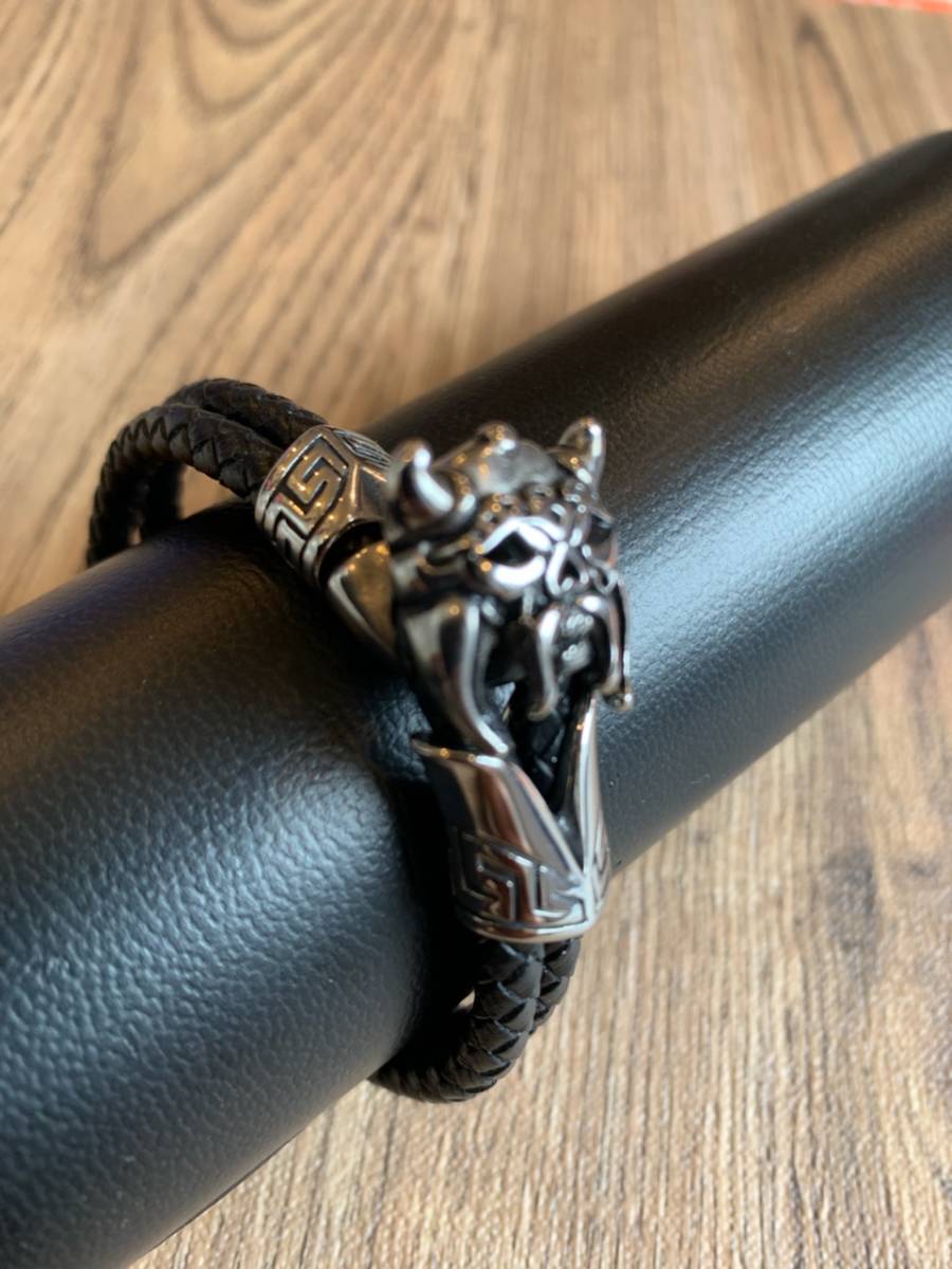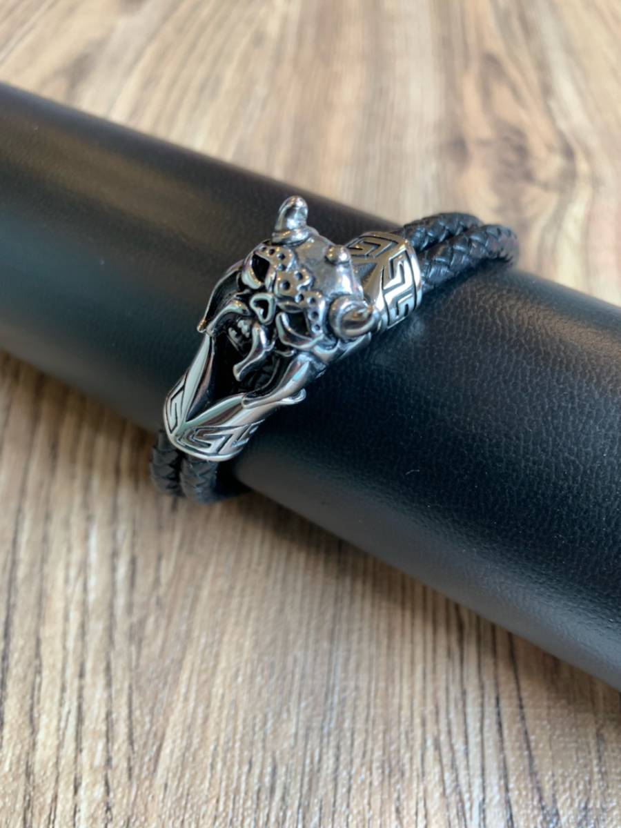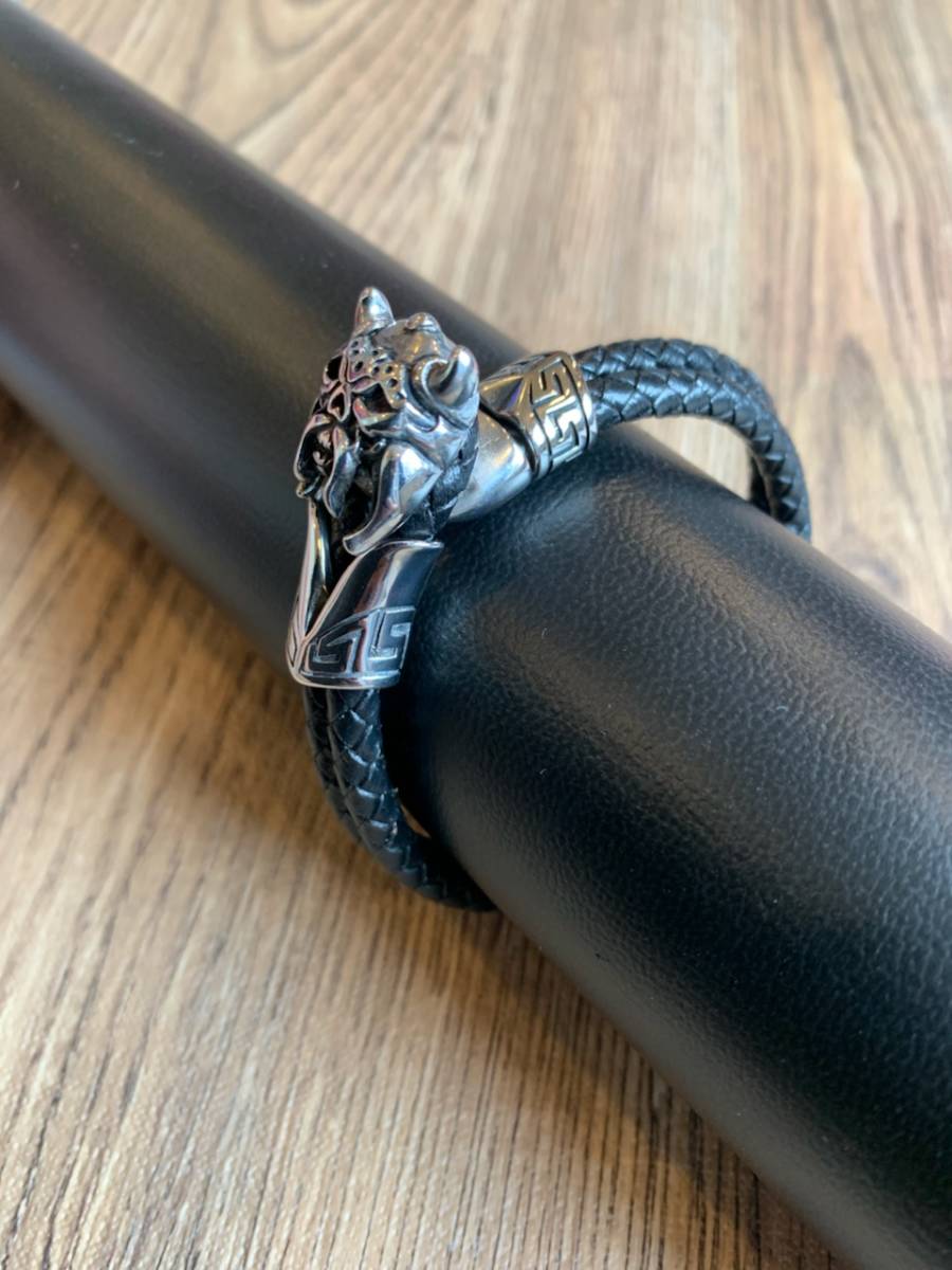 ステンレス ブレスレット 本革 レザー ダブルコード 編み込みレザー 新品 送料無料 ハーレー パンク ロック パンサーチャーム シルバー