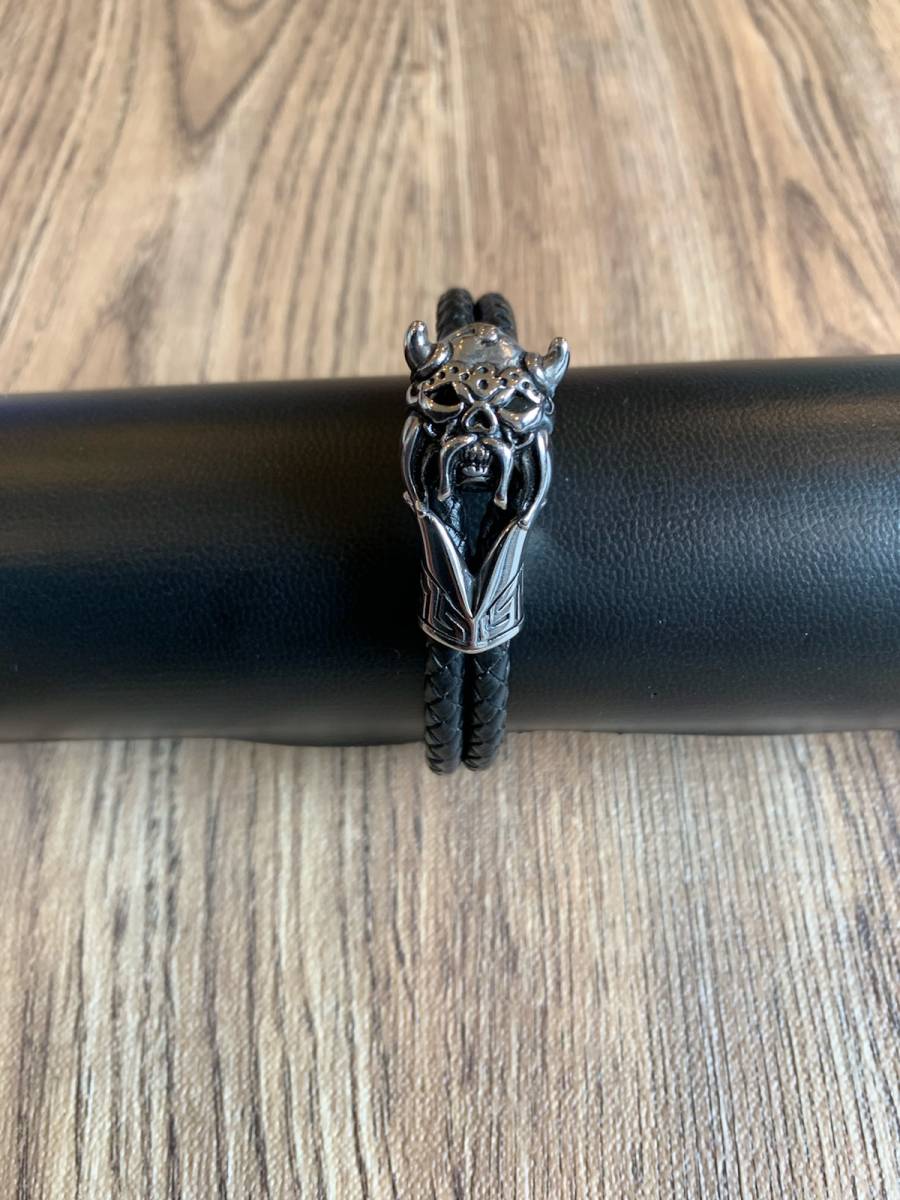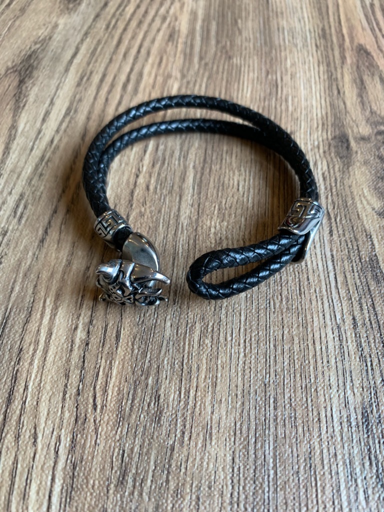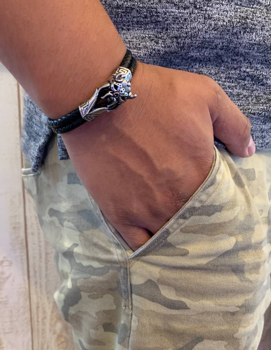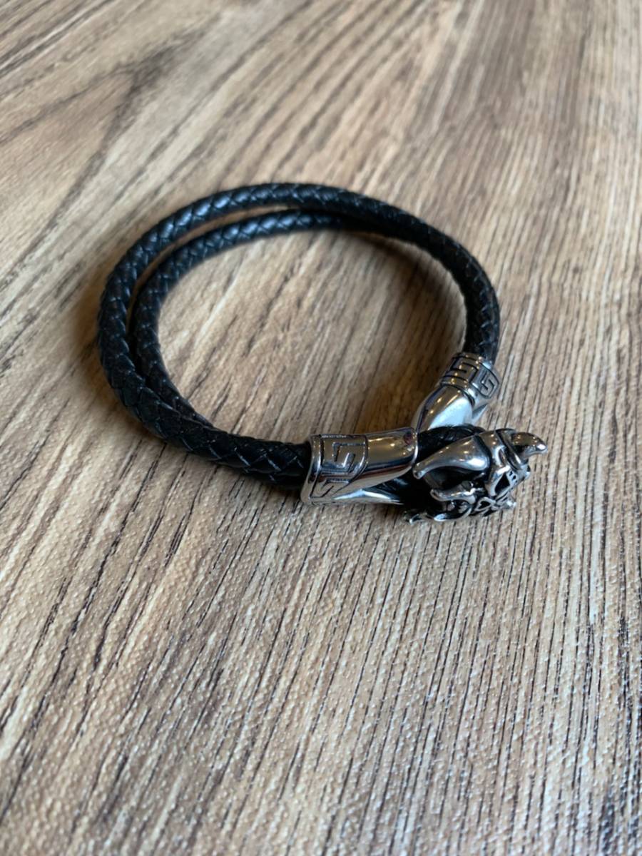 ステンレス ブレスレット 本革 レザー ダブルコード 編み込みレザー 新品 送料無料 ハーレー パンク ロック パンサーチャーム シルバー