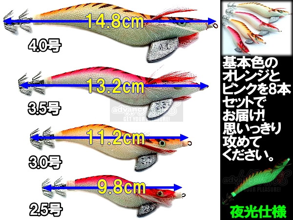 イカ釣り爆釣 エギ4種類8本セット 送料込み 蓄光塗料でアピール度満点 夜釣りアウトドア派の味方2.5号 3号 3.5号 4号各2本づつ
