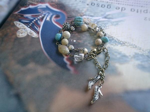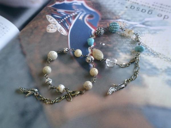 シック(?)なターコイズ!シリーズです♪ニュアンスのある石を集めて♪大人のブレスレット2本セットです♪10ミリ、8ミリの丸玉のアフリカンオパールやお花の模様のカレンシルバーはシックなアイボリー色でまとめて大人の表情です♪長さは全長23センチ位で調節自由です♪8ミリ位のターコイズはアフリカンオパールやラフ・カットのルチルクォーツや水晶や薔薇のチャームを合わせてシックに可憐にまとめました♪それぞれの石が自然な色なので長く着けていただけると思います♪♪長さは全長23センチ位で調節自由です♪シンプルで飽きのこないいつまでも着けられるデザインを考えて作りました!お揃いのネックレスも出品しています♪ハンドメイドをご理解頂いてノークレーム、ノーリターンでお願いします