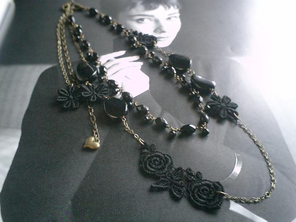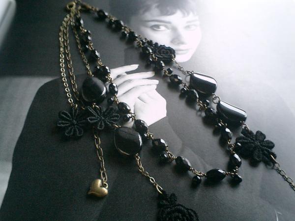 ロマンチックなオートクチュールシリーズです♪シックなオニキスと綿レースの薔薇のロマンチックで可愛いネックレス2本セットです♪パリ(??)っぽいアンティークな雰囲気で作りました。シンプルなデザインはオニキスの4ミリの丸玉と8×5ミリのライス型です♪シックで大人っぽい表情です♪長さは全長52センチ位で調節自由です♪綿レースの薔薇は18×13ミリ位のオニキスのオーバルツイストを合わせてひっそりロマンチックしています♪長さは全長65センチ位で調節自由です♪それぞれ単品でつけられても可愛いです♪お揃いのブレスレットも出品しています♪シンプルで飽きのこないいつまでも着けられるデザインを考えて作りました!ハンドメイドをご理解頂いてノークレーム、ノーリターンでお願いします