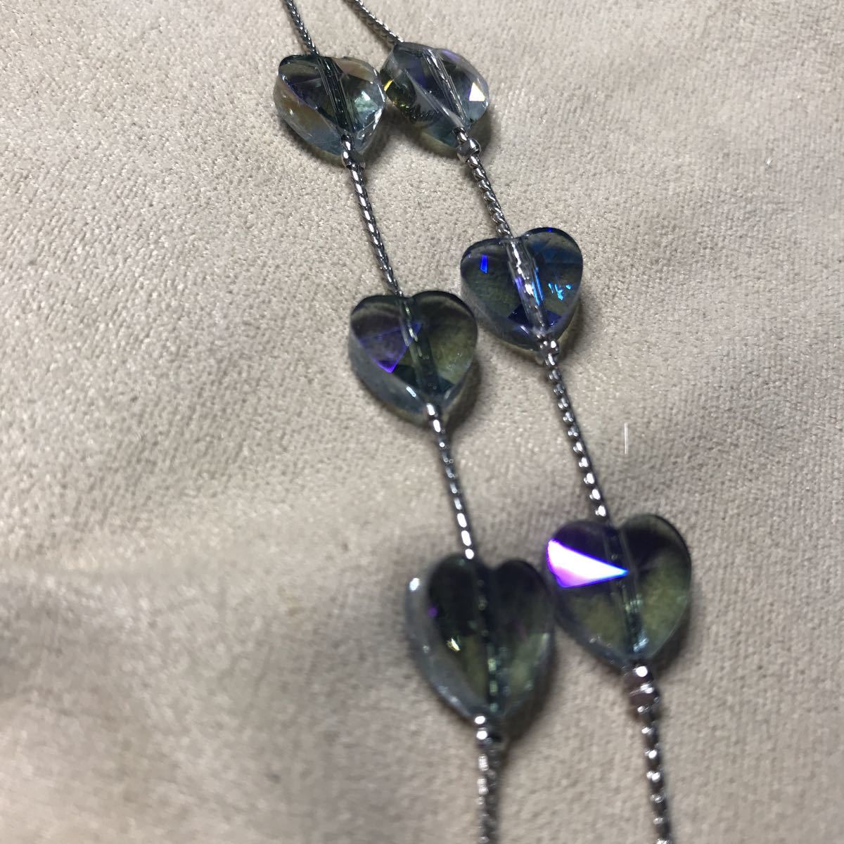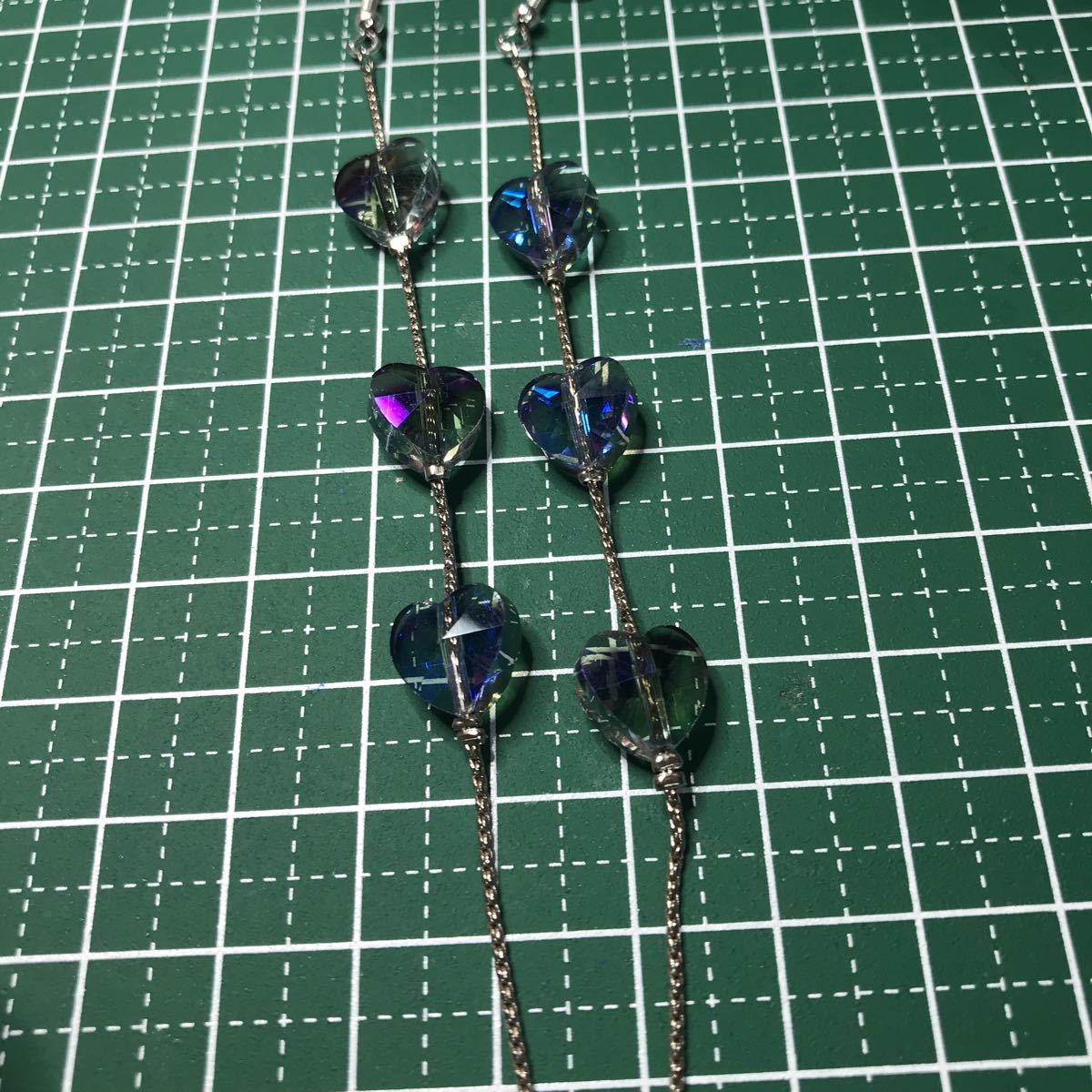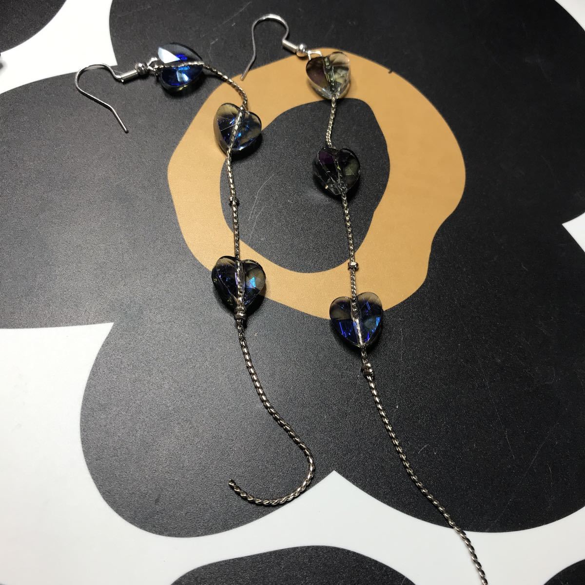 長さ13センチくらいあります。ハートガラスがキラキラとても綺麗でブルーのようなパープルのようなカラーです。フックはステンレスにプラチナメッキしたものを使用しております。