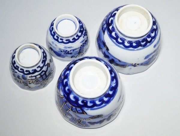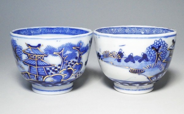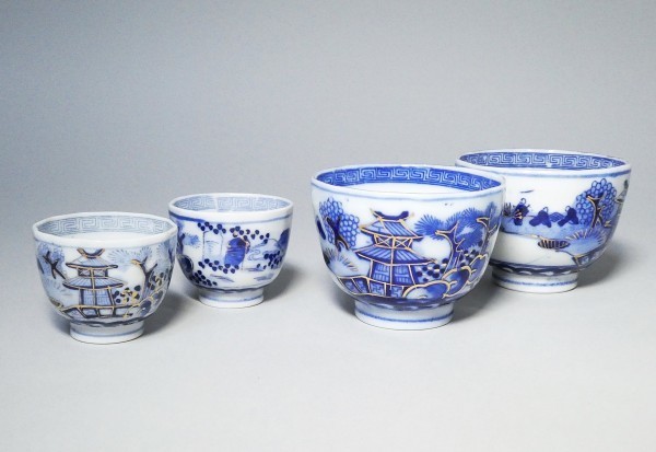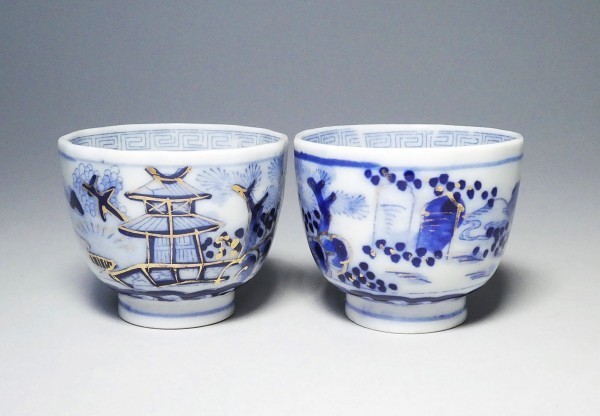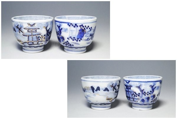 瀬戸 金彩 楼閣山水人物図 老松の図 輪花向付2客 小向付2客 計4つ NO.B5-2832