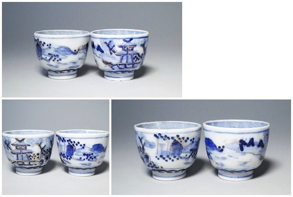 瀬戸 金彩 楼閣山水人物図 老松の図 輪花向付2客 小向付2客