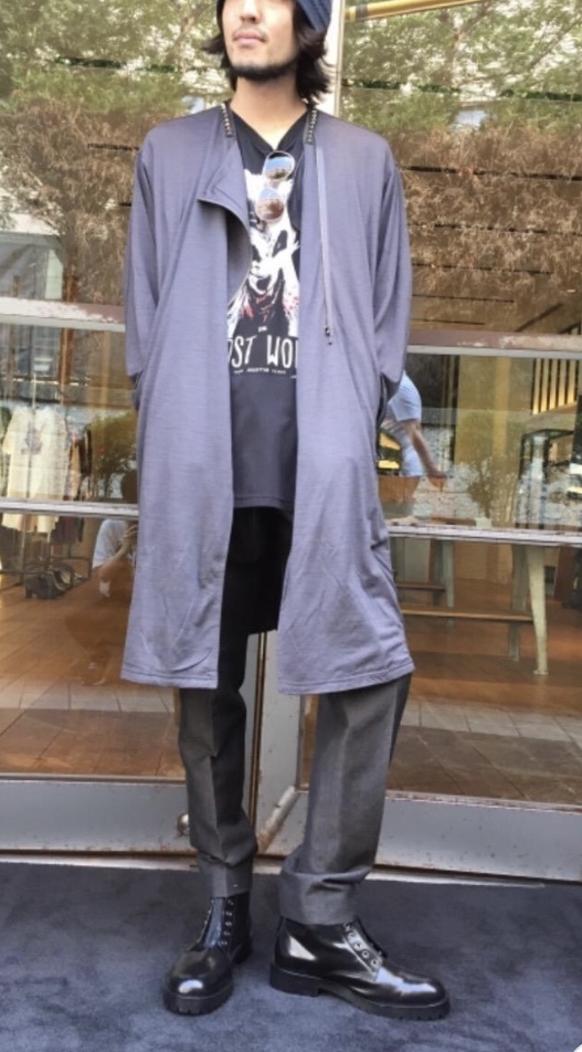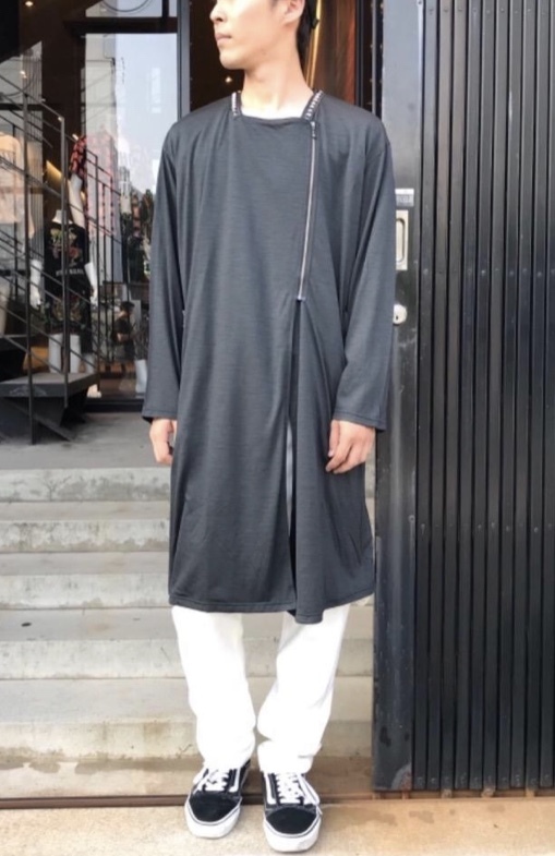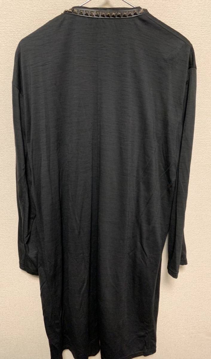 衿にあしらわれたスタッズと前開きのファスナーが印象的なロングジャケットです。