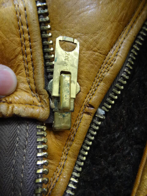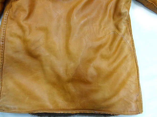 コンディション:ジッパーは画像のように歯が数か所抜けています。コツをつかめばあげられますが少々大変です。両袖に色褪せ感あり,背中下部に染み,右ポケットのループ取れています(ポケットの中にあります)。右ポケットの下部に小穴が3か所(6ミリ~1.3センチくらい),ライニング両脇下に小さい穴が数か所あります。レザーの硬化,嫌な臭いもありません。ダメージはいくらでもリペア可能な程度です。ジッパーを除いて致命的なダメージなどはありません。