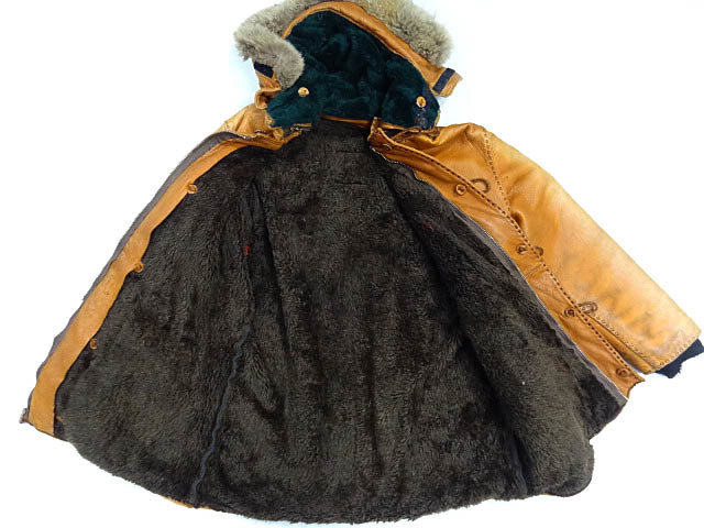 画像でも他をよせつけないオーラが伝わると思います。全てが謎なコートです。まずデザインはN3Bモチーフ、フードは着脱可能,市場でも見かけることのないUSARPのワッペンがついています。南極へレザーを着ることはまずありえないのでこれは後付けだと思います。ただワッペン自体にも希少価値がかなりあります。デザインベースは70Sのノースビーチのようなヒッピー風です。ウィップステッチが施されているのがわかると思います。ボタンも全て角が使用されています。メインのボタンはボタンだけでも高額なものが使用されています。フードはあたかも南極仕様のような完全防寒できるデザインです。ボアのライナーもおそらくカスタムでつけられたものです。フードとボディーの色が違うのも画像で確認出来ると思います。革質も肉厚なディアスキンだと思います。かなり上質です。そのため全体の重量はそれなりにあります。フードもリアルフォックスファーが使用されています。個人的にもこれだけ凄いカスタムジャケットは後にも先にも見かけることはないと断言できるレベルです。本当にすごい一着です。全てに贅沢の極みが注がれたカスタムコートです。