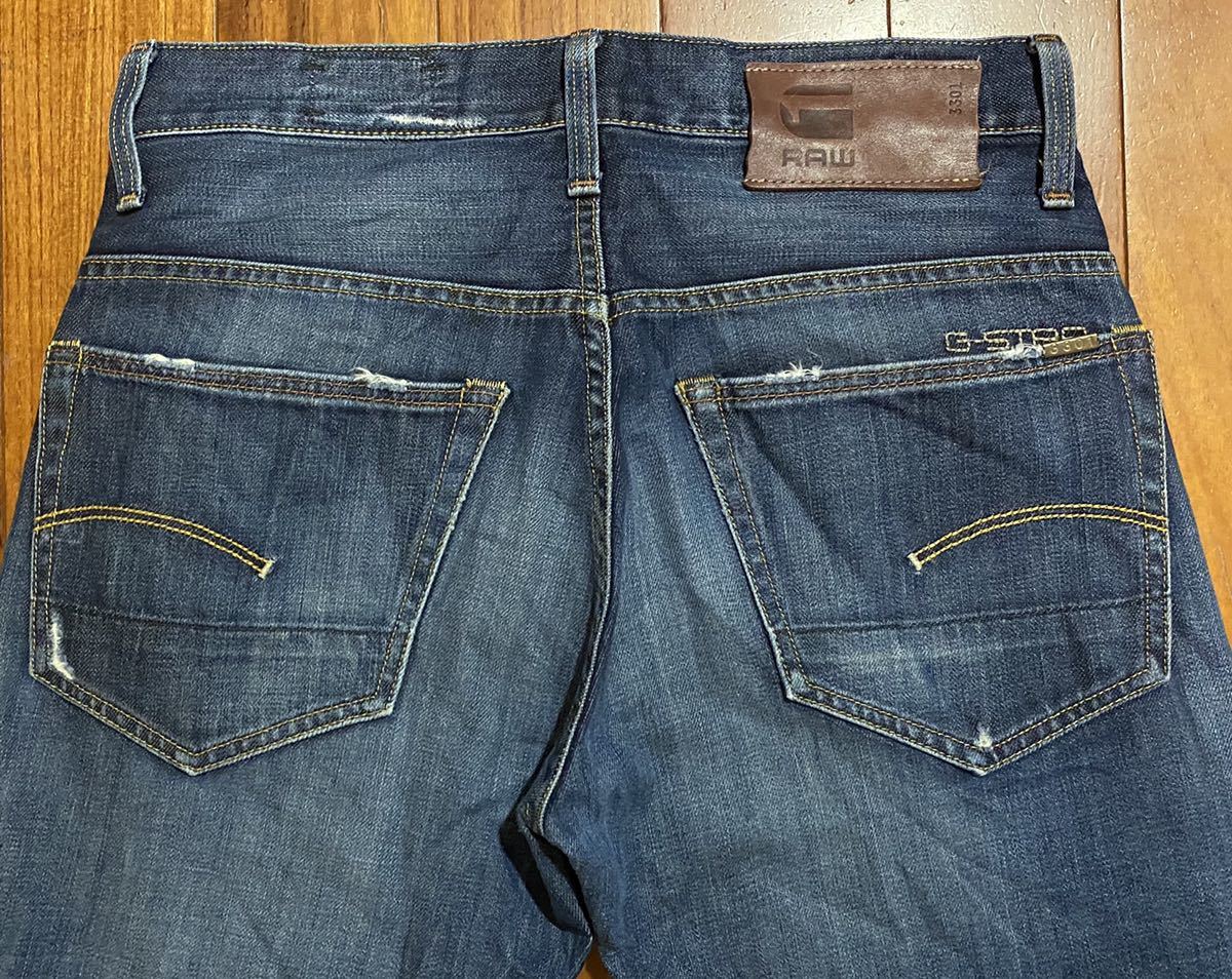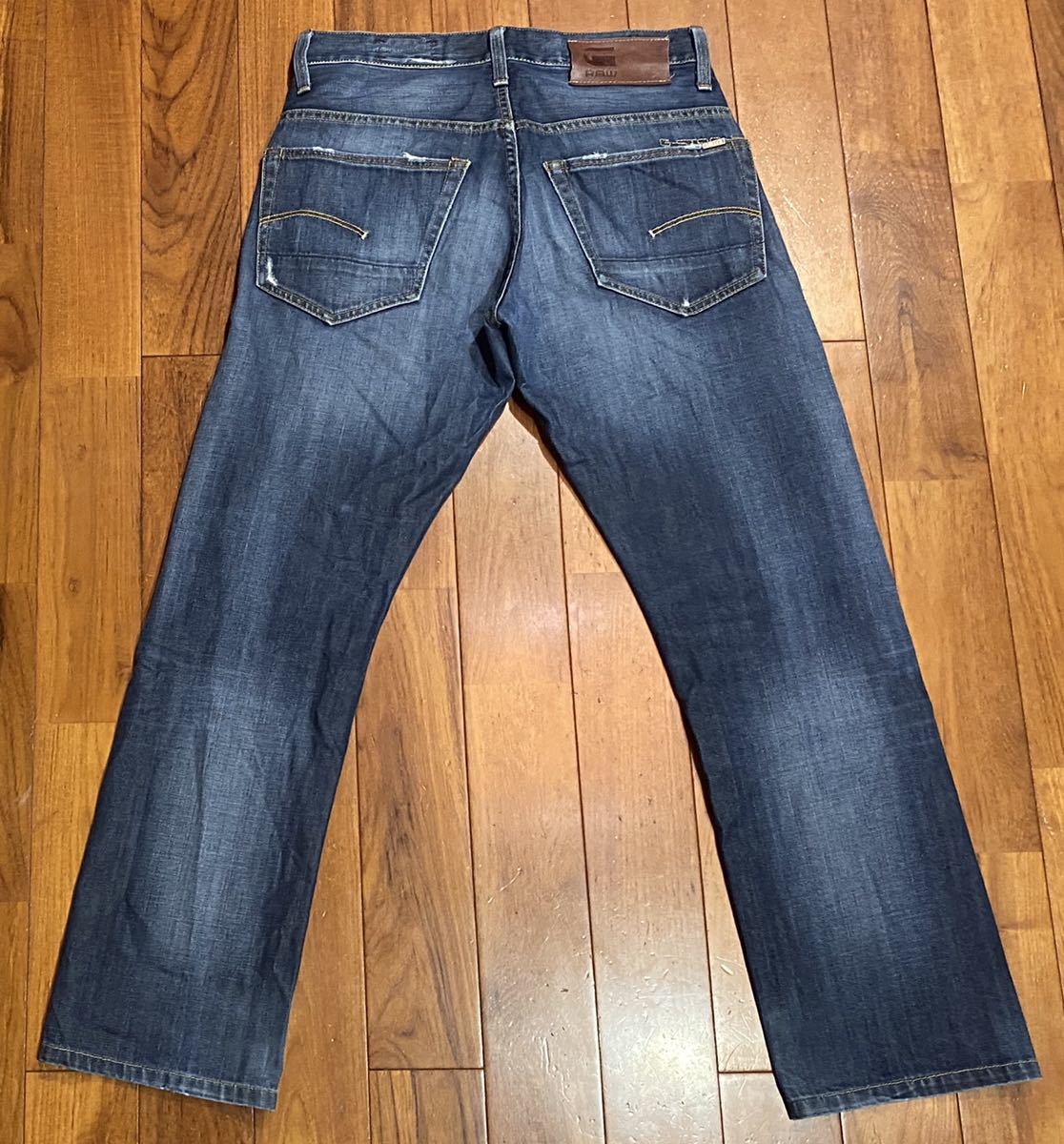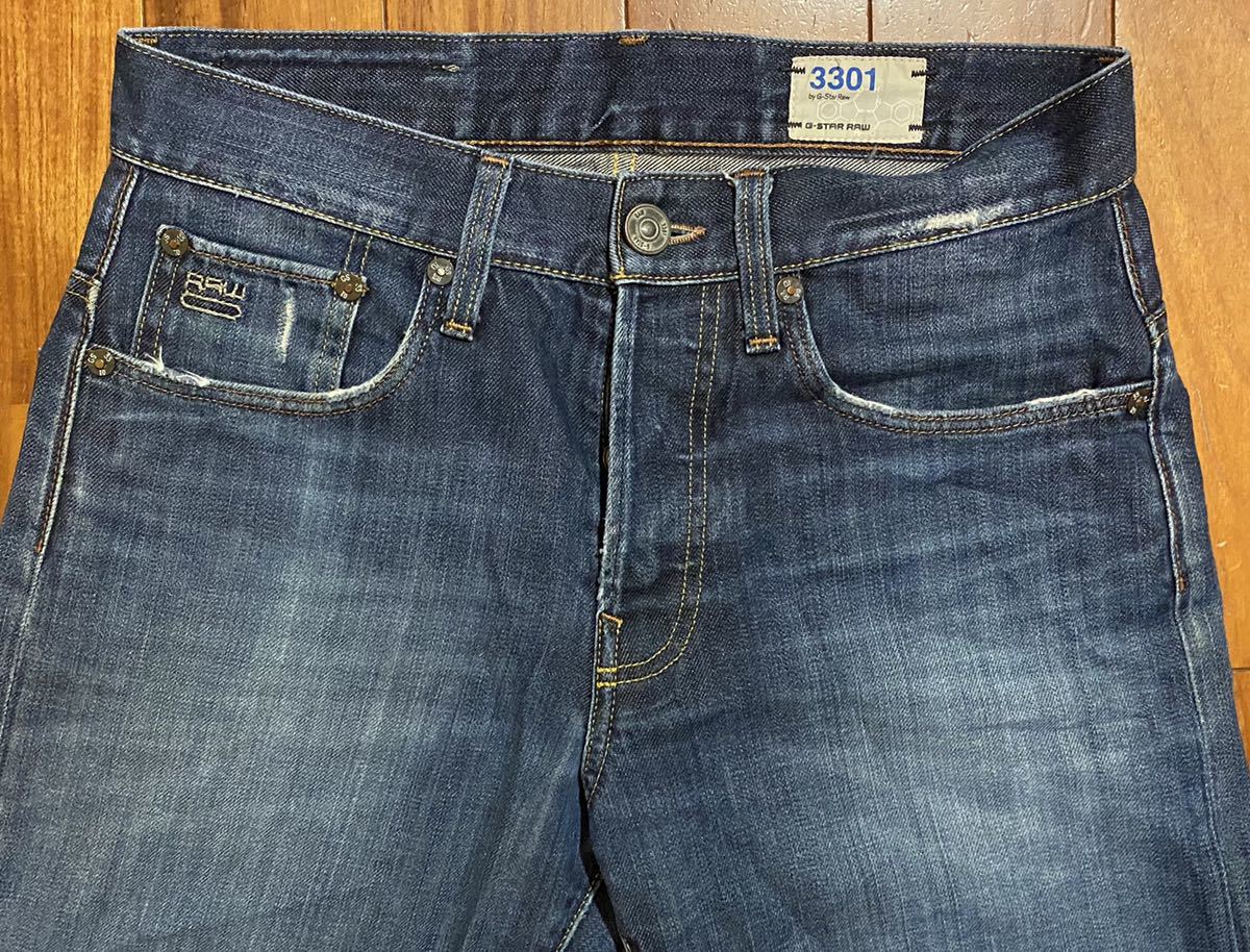 ジースターロウのデニム(ジーンズ)、3301 STRAIGHT 50128 2886 1368です。色はインディゴブルーです。USEDですが状態は良いです(10段階中7程度)。牛革パッチ、ボタンフライです。生地は綿100%です。正規品です(ジースターインターナショナル(株)、インド製)。サイズはW28でウエストは重ねずに平置きで約75cm、ヒップ約100cm、股上約27cm、股下約72cm、股下15cmのふともも部分約51cm、裾まわり約39cm、重量約530gです。発送はゆうパケットポストになります。
