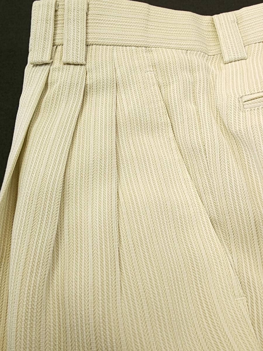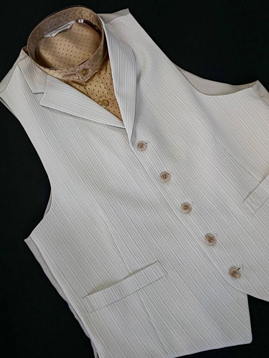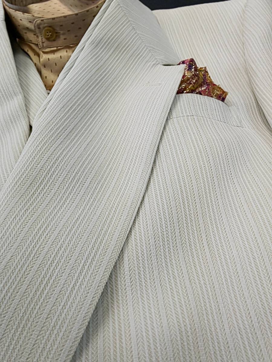 特徴      サラッとした生地のストライプ柄ジャガード織りでオシャレなW一つ掛けのスリーピースです。