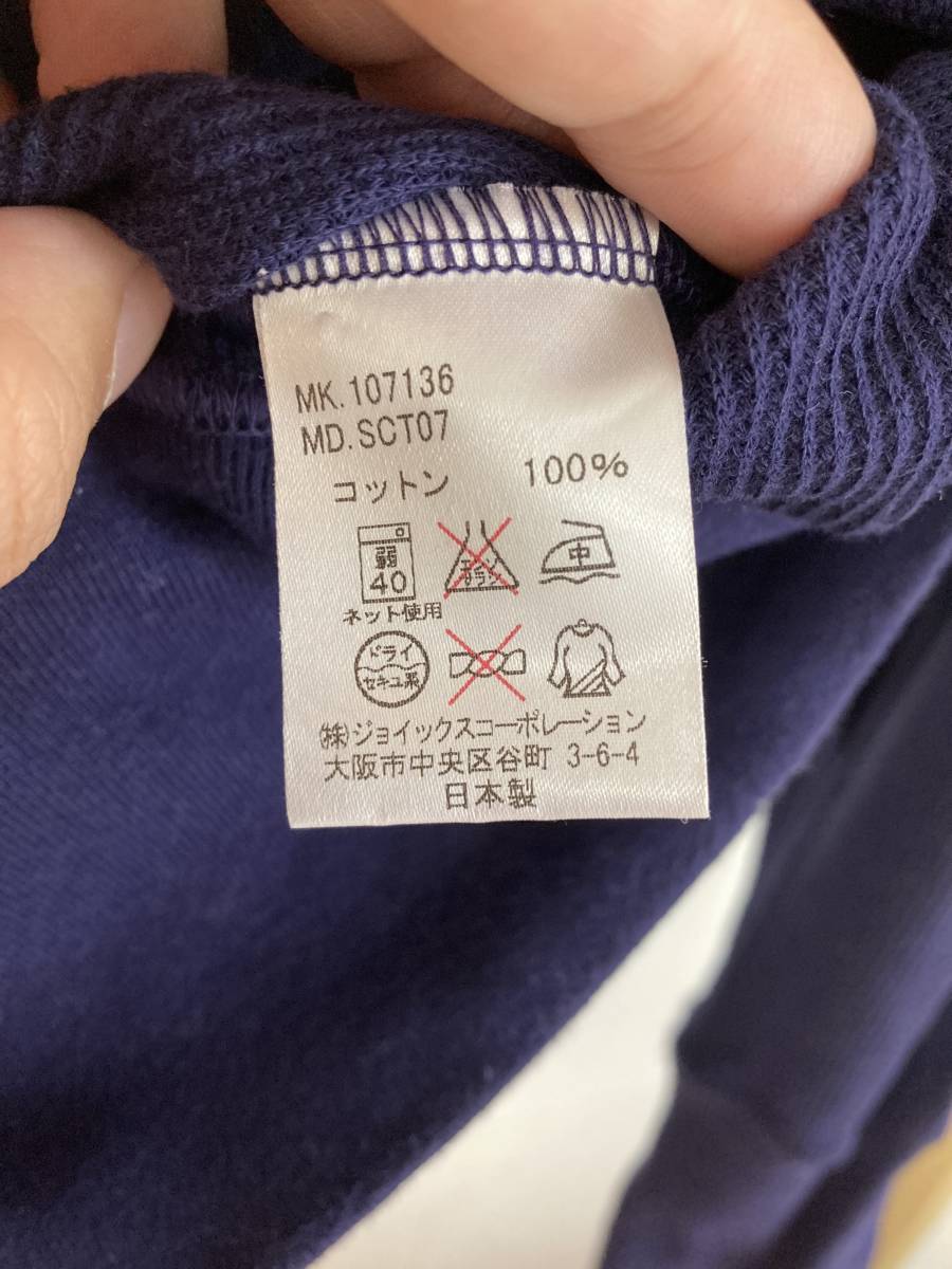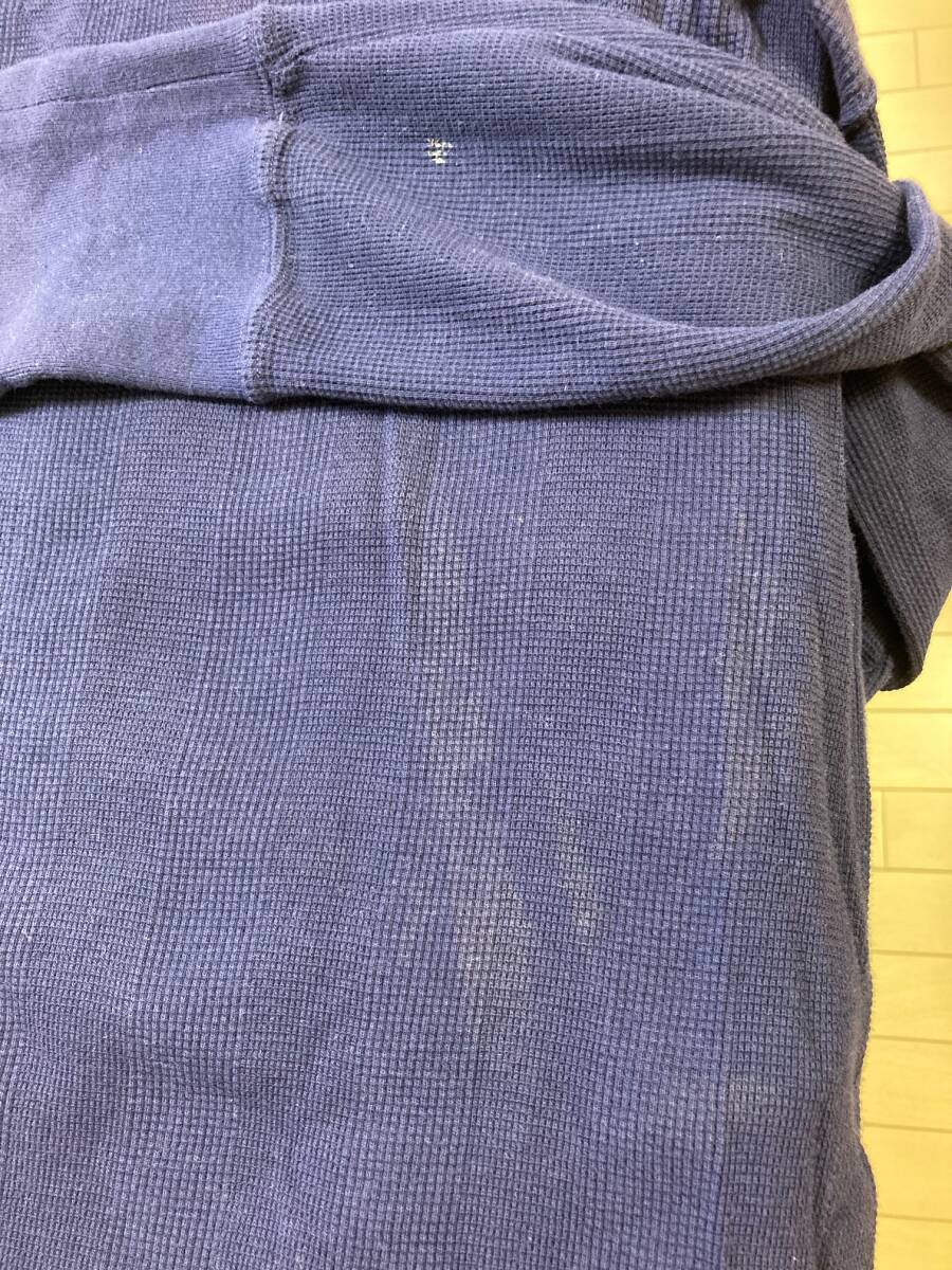 主に自宅で部屋着として着用していました。中古にしては状態は良いと思います。特に目につく汚れ等はありませんが、使用感はあります。ブランドタグのあるストライプの生地部分に、若干色が滲んでいるように見えます。生地は、若干サーマル風です。遠目には無地に見えますが、折り柄があります。