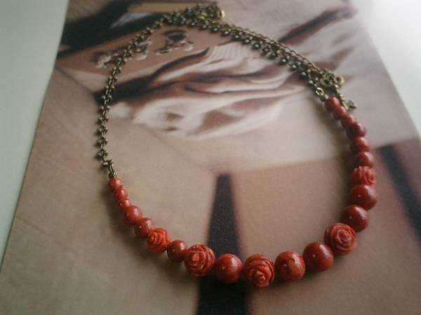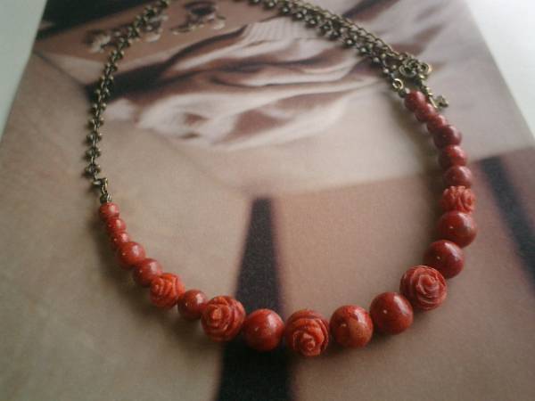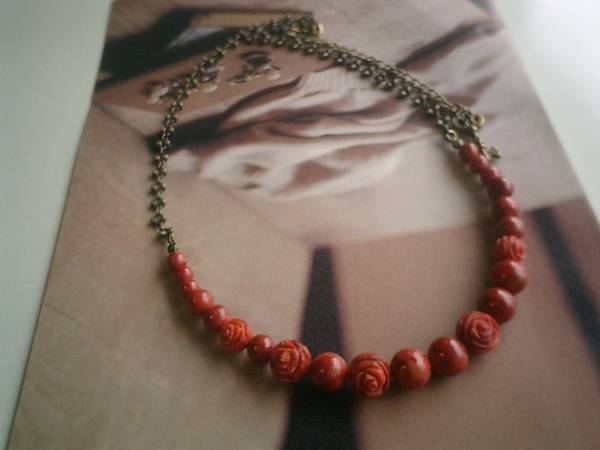 アート・クチュール・・シリーズです♪お気に入りの赤・・深い赤のスポンジ珊瑚のネックレスです♪6ミリ、8ミリ、10ミリの大きさ違いの丸玉のスポンジ珊瑚に8ミリ、10ミリの両面薔薇のスポンジ珊瑚やお花のチェーンを合わせてキュートな表情です♪長さは全長63センチ位で調節自由です♪チョーカー風にされても素敵です♪お揃いのブレスレットも出品しています♪♪シンプルで長く着けていただけるデザインを考えて作りました♪ハンドメイドをご理解頂いてノークレーム、ノーリターンでお願いします
