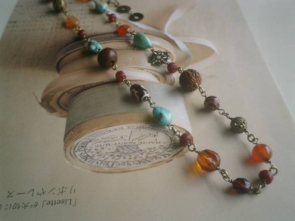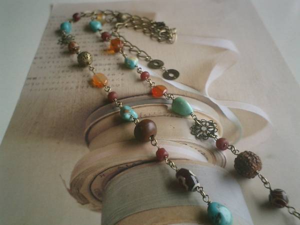 ロゼッタのお気に入り・・シリーズです♪シック・ボヘミアン・・オリエンタルな素材や色を集めたネックレスです♪5ミリから15ミリ位までのターコイズやとんぼ玉や瑪瑙や菩提珠やベネチアビーズやカーネリアンや透かしチャームやチェコビーズを合わせて大人のロマンチックしています♪長さは全長83センチ位で調節自由です♪2連にされても素敵です♪同じデザインの長さ違いのネックレスやブレスレットも出品しています♪♪シンプルで飽きのこないいつまでも着けられるデザインを考えて作りました!ハンドメイドをご理解頂いてノークレーム、ノーリターンでお願いします