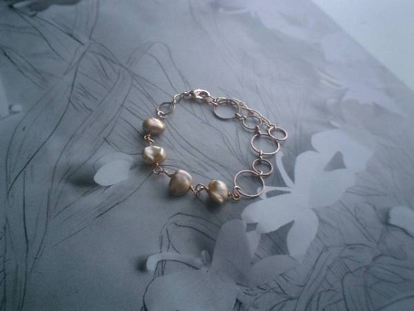 恋愛映画のレシピ・・シリーズです♪パールに恋して・・シックなベージュピンクの淡水パールのブレスレットです♪ピンクゴールドのチェーンを合わせて甘すぎない大人のロマンチックしています♪10ミリ位の芥子パールにデザインチェーンを合わせて可憐な表情です♪長さは全長23センチ位で調節自由です♪お揃いのブレスレットやネックレスも出品しています♪♪シンプルで飽きのこないいつまでも着けられるデザインを考えて作りました!ハンドメイドをご理解頂いてノークレーム、ノーリターンでお願いします