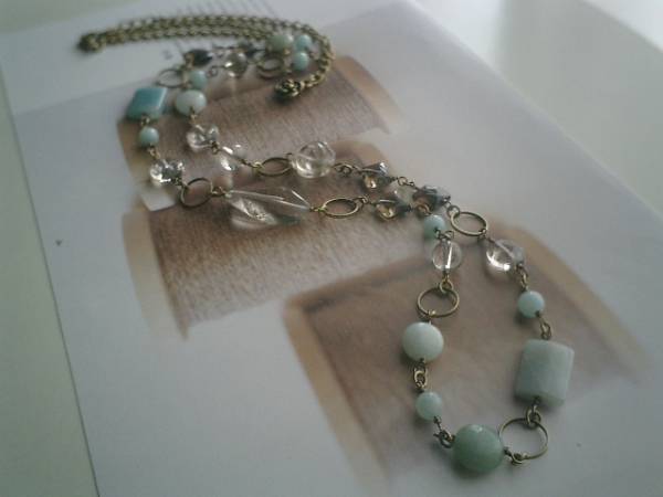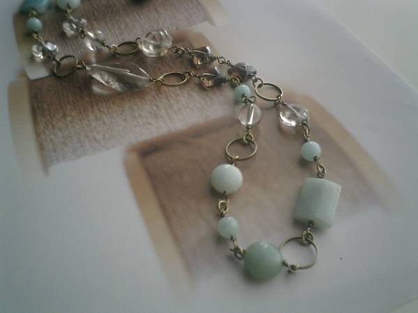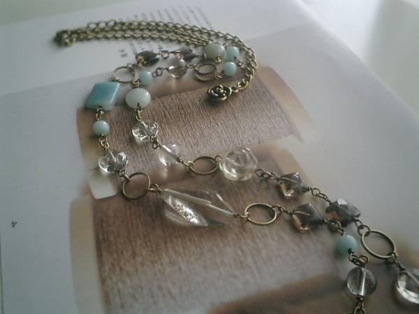 ロゼッタのおめかし・・シリーズです♪♪妖精の時間・・可憐なアマゾナイトと薔薇のネックレスです♪シックなブルーグレーのアマゾナイトとスモーキークォーツの薔薇を合わせて神秘的な表情です♪6ミリの丸玉、11×15ミリのレグタングル、10ミリのコインなどデザイン違いのアマゾナイトに8ミリの丸玉、9ミリのカットスクエア、10ミリのコインカット、25×10ミリのツイストマーキス、14ミリの薔薇などデザイン違いのスモーキークォーツを合わせました♪深い色や淡い色を集めてアートにロマンチックしています♪長さは全長92センチ位で調節自由です♪2連にされても素敵です♪お揃いのネックレスやブレスレットも出品しています♪シンプルで合わせやすいデザインを考えて作りました♪ハンドメイドをご理解いただいてノーリターン、ノークレームでお願いします♪