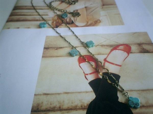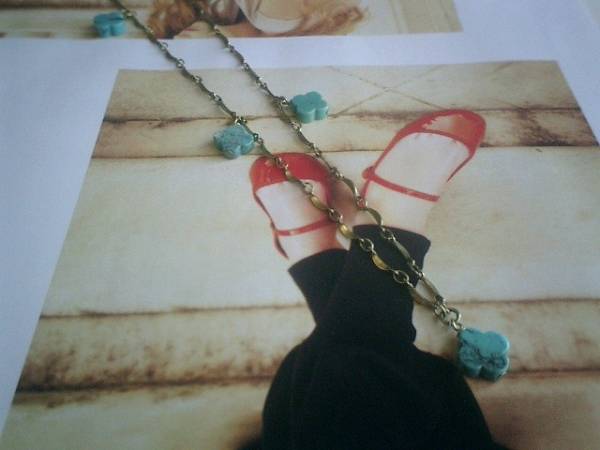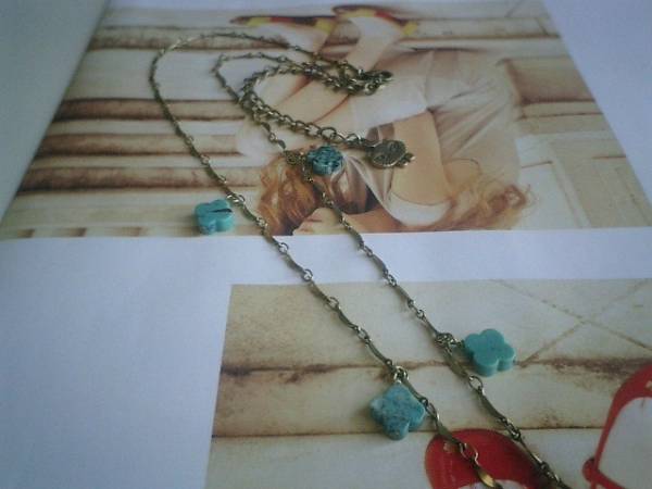 ナイーブ少女・・シリーズです♪春色ターコイズ・・キュートなターコイズのネックレスです♪10ミリ位のフラワーモチーフのターコイズにデザインチェーンを合わせて可憐な表情です♪長さは全長77センチ位で調節自由です♪♪お揃いのネックレスやブレスレットやピアスも出品しています♪ハンドメイドをご理解いただいたノークレーム・ノーリターンでお願いします♪