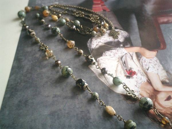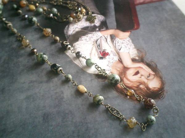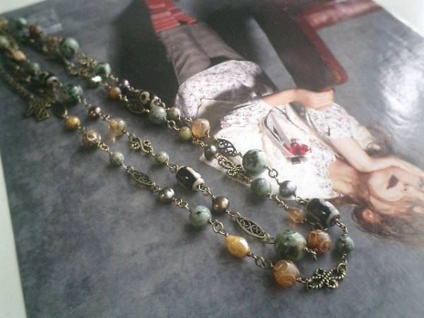 大人色の物語・・シリーズです♪ターコイズ・デッサン・・シックなターコイズのネックレスです♪6ミリ、8ミリ、10ミリの丸玉のターコイズに個性的な模様の天珠やパープルグレーの淡水パールやデザインチェコ、デザインチェーンを合わせてオリエンタルな表情です♪長さは全長115センチ位で調節自由です♪画像のように2連にされても素敵です♪同じデザインの長さ違いのネックレスやブレスレットも出品しています♪シンプルで飽きのこないいつまでも着けられるデザインを考えて作りました!ハンドメイドをご理解頂いてノークレーム、ノーリターンでお願いします
