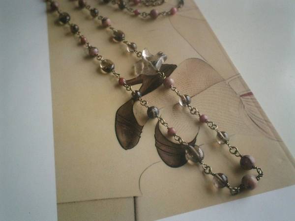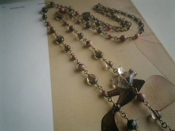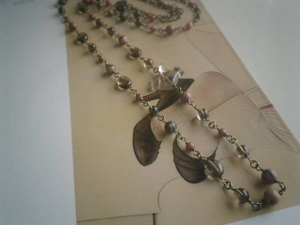 やさしい春に・・シリーズです♪繊細なスモーキークォーツとロードナイトのネックレスです♪4ミリ、6ミリの丸玉、8×10ミリのオーバルのスモーキークォーツやロードナイトに24ミリ位のスモーキークォーツの鳩さんを合わせてさりげなくロマンチックしています♪長さは全長104センチ位で調節自由です♪2連にされても素敵です♪お揃いのブレスレットも出品しています♪シンプルで飽きのこないいつまでも着けられるデザインを考えて作りました!ハンドメイドをご理解頂いてノークレーム、ノーリターンでお願いします