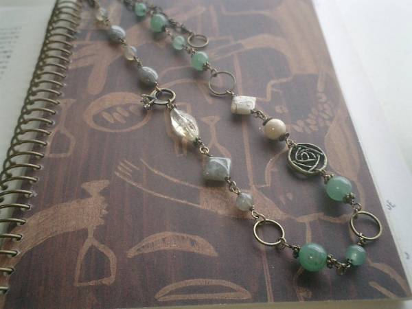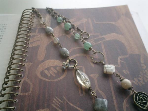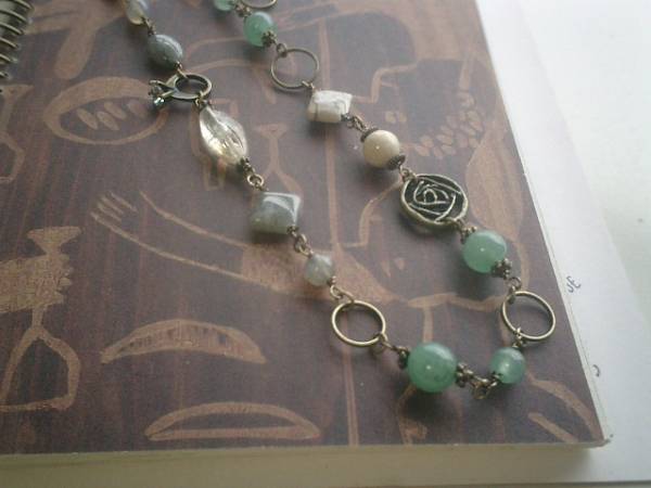 薔薇の香りの女の子・・シリーズです♪春色を集めて・・オフホワイトやグリーンでまとめたふんわりやさしい色のネックレスです♪6ミリ、8ミリ、10ミリの丸玉、10ミリのコイン、スクエアのアフリカンオパール、6ミリの丸玉、10ミリのスクエア、8×12ミリのオーバルのラブラドライト、10×22ミリのマーキスのシトリン、6ミリ、8ミリの丸玉のグリーンアベンチュリンに薔薇の透かしチャームやジルコニアリングを合わせて大人のロマンチックしています♪長さは全長65センチ位で調節自由です♪チョーカー風にされても素敵です♪♪長さ違いのネックレスやお揃いのブレスレットやイヤリングも出品しています♪♪シンプルで長く着けていただけるデザインを考えて作りました♪ハンドメイドをご理解頂いてノークレーム、ノーリターンでお願いします