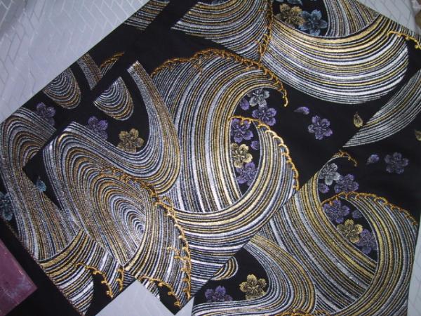 京都西陣 じゅらく の 若向きよう(振袖、訪問着、付け下げ、無地、小紋、など向き)のTOPブランド品『花かるた(花かおり)』ブランドです。6通柄袋帯 新品未仕立て品、絹100%金属糸等使用  くろ色地 金銀の波にさくら舞う、、