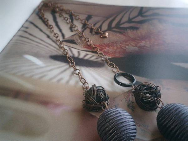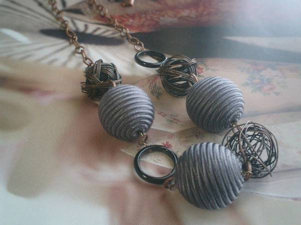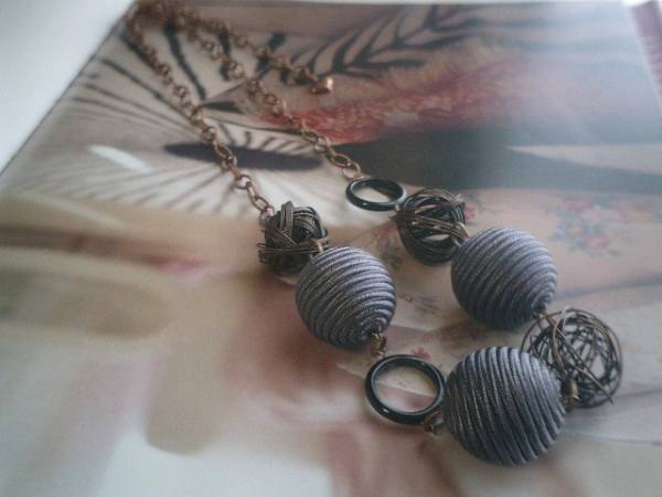 センチメンタル・ガール・・シリーズです♪薔薇のフレグランス・一足早い秋色仕様のネックレスです♪オニキスリングの黒、サテンボールのチャコールグレー、ワイヤーデザインボールのブラウンとシックなお色でまとめました♪オニキスリングは18ミリ位、ワイヤーボールは20ミリ位、サテンボールは24ミリから26ミリ位の大きさ違いです♪デザインチェーンを合わせて大人のロマンチックしています♪長さは全長70センチ位で調節自由です♪チョーカー風にされても素敵です♪お揃いのブレスレットも出品しています♪シンプルでいつまでも着けられるデザインを考えて作りました!ハンドメイドをご理解頂いてノークレーム、ノーリターンでお願いします