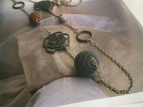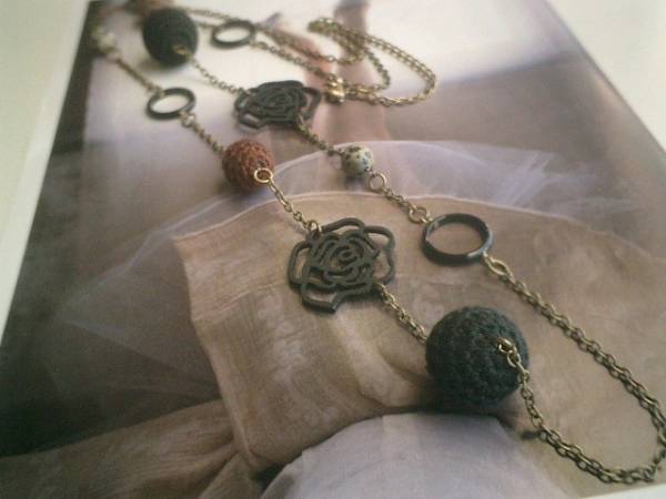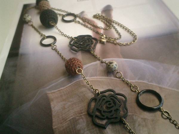 秋のヒロイン・・シリーズです♪シックな黒とブラウンのネックレスです♪秋色の異素材やオニキスを合わせて大人のロマンチックしています♪オニキスリングや15ミリから20ミリ位までの編みボールやダルメシアンの丸玉や30ミリの薔薇のウッドを合わせてキュートなデザインです♪長さは全長115センチ位で調節自由です♪2連にされても可愛いです♪♪お揃いのネックレスやブレスレットも出品しています♪シンプルで合わせやすいデザインを考えて作りました♪ハンドメイドをご理解いただいてノーリターン、ノークレームでお願いします♪