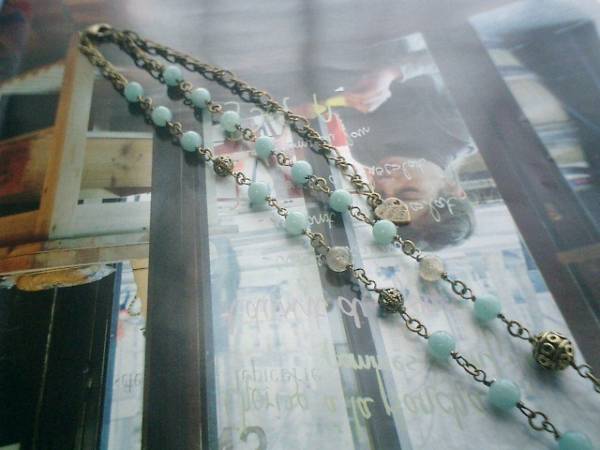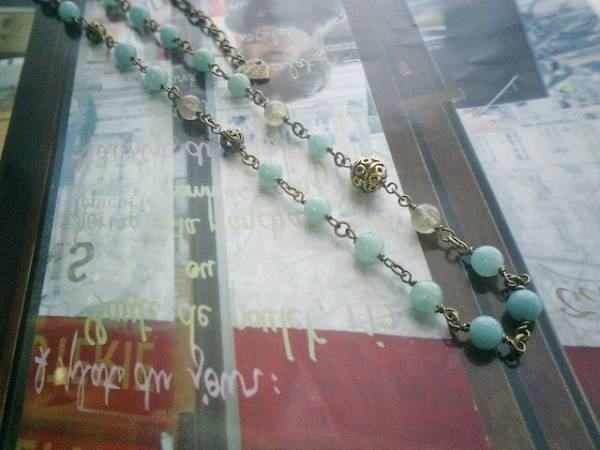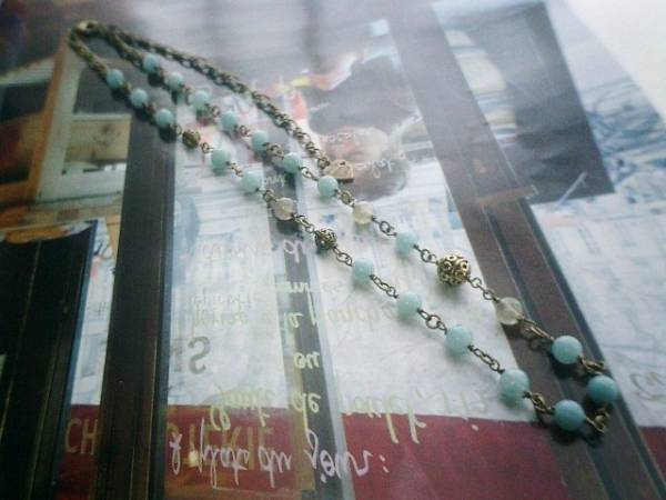 ロマンチック見本帳・・シリーズです♪水色エレガンス・・可憐なアマゾナイトのネックレスです♪6ミリのアマゾナイトは6ミリのラブラドライトの丸玉やデザインメタルを合わせてアンティークな表情です♪長さは全長63センチ位で調節自由です♪チョーカー風にされても可愛いです♪♪お揃いのネックレスやブレスレットも出品しています♪シンプルで飽きのこないいつまでも着けられるデザインを考えて作りました!ハンドメイドをご理解頂いてノークレーム、ノーリターンでお願いします