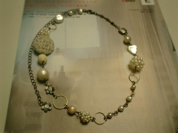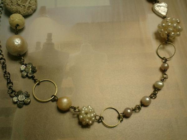 キュートでロマンチックな淡水パールのネックレスです♪やさしいオフ・ホワイトの淡水パールは4ミリから11ミリ位まで形も様々です♪可愛い淡水パールのボール球は10ミリ、13ミリ、15ミリで大きなコットンパールは13ミリ、15ミリ、レースの布ボタンは23ミリ、シックなベージュのビーズ玉は10ミリ位です♪間に個性的なメタルビーズを挟んでいます♪やさしいお色でまとめていますので合わせやすいと思います。シンプルで飽きのこないいつまでも着けられるデザインを考えて作りました!長さは全長63センチで留める位置によって表情が変わって楽しいです♪短くチョーカー風に着けても可愛いです。お揃いのブレスレットも出品予定です♪ハンドメイドをご理解頂いてノークレーム、ノーリターンでお願いします