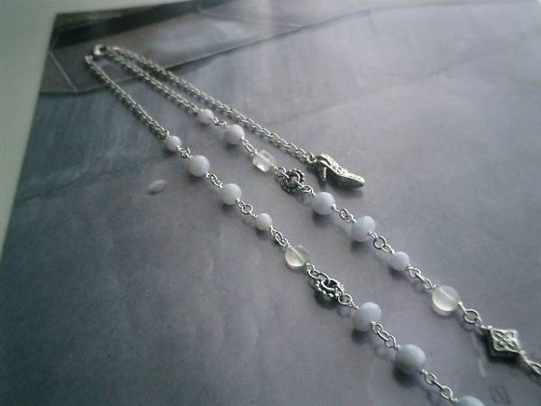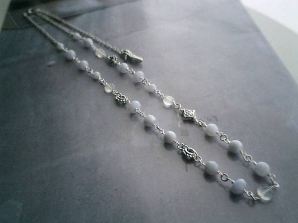 アート・ロマン主義・・シリーズです♪アンジーの夏・・可憐なブルーレースのネックレスです♪シックなブルーグレーのブルーレースは6ミリの丸玉、8ミリの丸玉、8×5ミリ位のボタンカットです♪8ミリのコインやチューブのホワイトムーンストーンやデザインメタルを合わせてひそやかにロマンチックしています♪長さは全長65センチ位で調節自由です♪お揃いのネックレスも出品しています♪シンプルで飽きのこないいつまでも着けられるデザインを考えて作りました!ハンドメイドをご理解頂いてノークレーム、ノーリターンでお願いします
