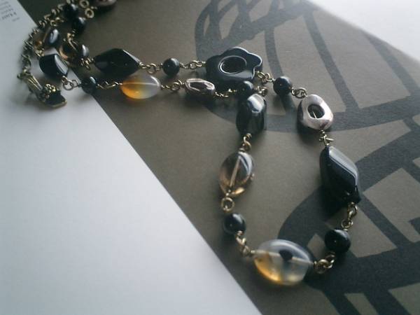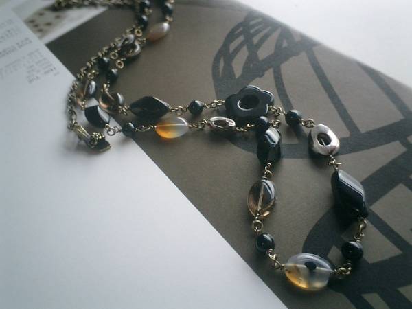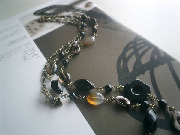 カワイイと可愛いの間に・・シリーズです♪キュートなオニキスのネックレスです♪オニキスは6ミリの丸玉や18×13ミリのツイストナツメ、20ミリの穴あきフラワーです♪繊細な模様が個性的なボツワナアゲートのオーバルやスモーキークォーツやブラックシェルなど大人色の石を合わせてさりげなくロマンチックしています♪長さは全長88センチ位で調節自由です♪♪2連にされても素敵です♪お揃いのブレスレットも出品しています♪♪シンプルで飽きのこないいつまでも着けられるデザインを考えて作りました!ハンドメイドをご理解頂いてノークレーム、ノーリターンでお願いします