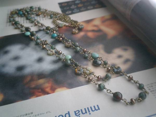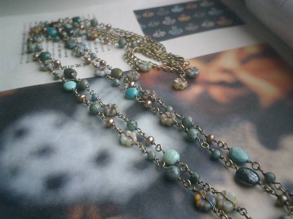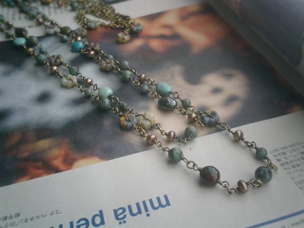 ベーシック・スタイル・・シリーズです♪野の花のように・・可憐なターコイズのネックレス2本セットです♪同じデザインの長さ違いです♪1本をネックレスに1本をブレスレットにと色々に楽しんでいただけます♪4ミリ、6ミリの丸玉のターコイズに8ミリのコインや10ミリのオーバルのクリソコラやアンティークのチェコビーズやブロンズゴールドの淡水パールを合わせてひっそりロマンチックしています♪長さは長い方は全長100センチ位で調節自由です♪2連にされても可愛いです♪短い方は全長75センチ位で調節自由です♪ブレスレットにされても素敵です♪それぞれ単品でも出品しています♪シンプルで飽きのこないいつまでも着けられるデザインを考えて作りました!ハンドメイドをご理解いただいてノークレーム、ノーリターンでお願いします
