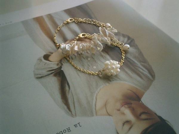 センチメンタル気分・・シリーズです♪やさしい人に・・可憐な淡水パールのブレスレット2本セットです♪オフホワイトやライトベージュの芥子パールのチップは7ミリから13ミリ位です♪やさしいお色が大人のロマンチックしています♪長さは23センチ位で調節自由です♪14ミリ位の淡水パールボールは華奢なチェーンを合わせてキュートな表情です♪長さは16センチ+アジャスター6センチで最長22センチ位です♪単品やお揃いのネックレスも出品しています♪♪シンプルで飽きのこないいつまでも着けられるデザインを考えて作りました♪ハンドメイドをご理解頂いてノークレーム、ノーリターンでお願いします